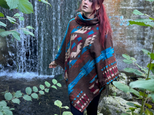gemütlicher warmer Poncho, Überwurf, Bohemian Poncho, Boho Überwurf braun/blau/beige P01