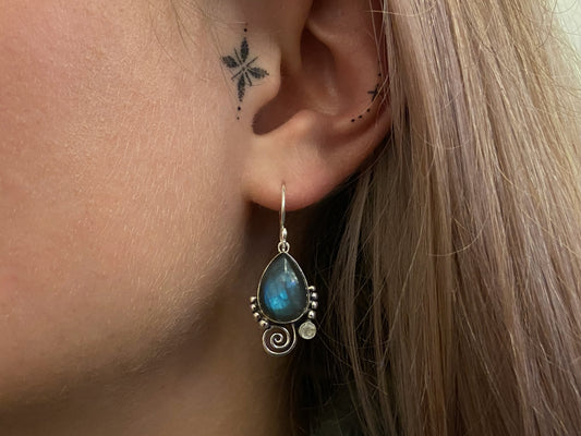 hängende tropfenförmige Ohrringe mit Stein, Spirale und Pünktchen, Labradorit oder Regenbogenmondstein