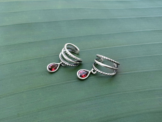 Ohrclip mit baumelndem roten Stein in Tropfenform, Silber 925