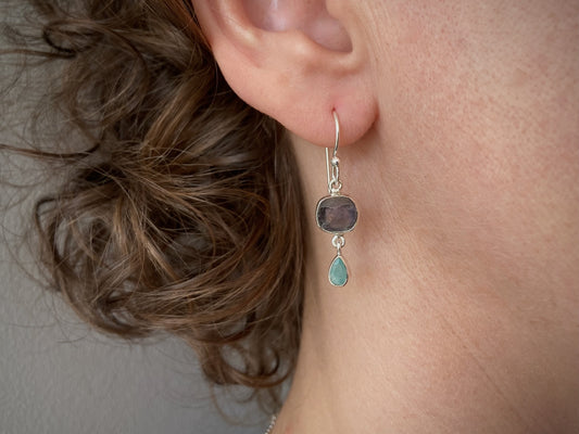 schlichte Ohrringe aus Silber mit facettiertem ovalem Labradorit Stein und baumelnden Kügelchen