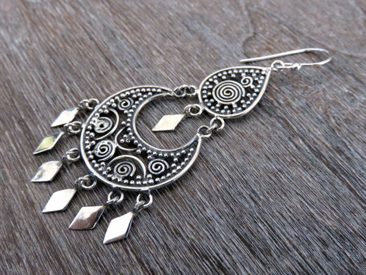 filigrane Ohrringe mit Spiralen, Pünktchen und baumelnden Rauten aus Silber, Hängeohrringe