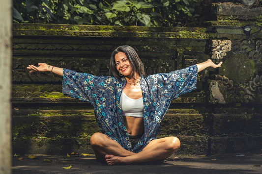 Boho Kimono mit filigranem Muster – Leichter Überwurf für Damen in blau beige gold