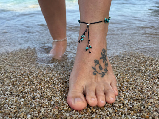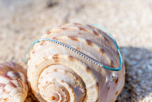 verstellbares, zweireihiges türkises Fusskettchen mit kleinen Silberperlen, Oberarmband