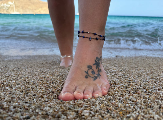 verstellbares, zweireihiges Fusskettchen mit kleinen Lapis Lazuli Steinen und Silberperlen, Oberarmband