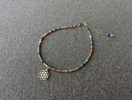 Fusskettchen mit Blume aus Messing und farbigen Perlen