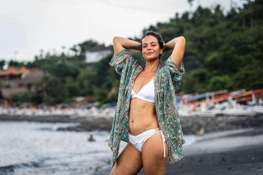 hellblau weiß beige gemusterter Kimono, Bluse, Überwurf, leichte Jacke