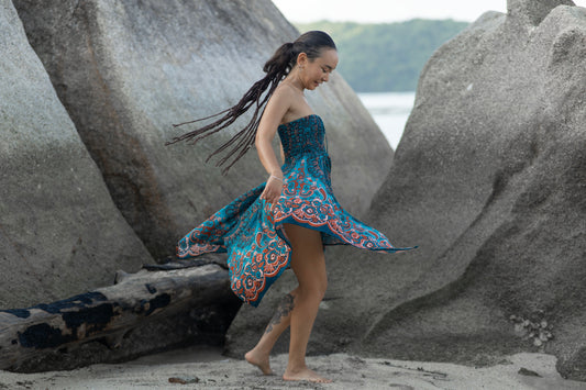 türkis orange gemusterter Rock mit Fransen, Sommerkleid, Elfenkleid, Zipfelrock, Fransenrock