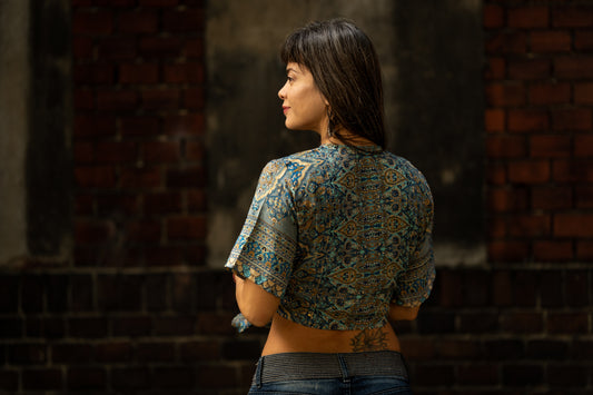 kurzer Kimono zum Binden, Bluse, Sommerbluse, Überwurf, blau gold gemustert