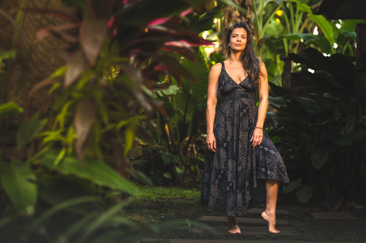 langes ärmelloses Kleid mit V-Ausschnitt in schwarz mit filigranem Muster