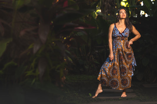 langes ärmelloses Kleid mit V-Ausschnitt in braun blau