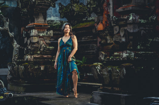 langes ärmelloses Kleid mit V-Ausschnitt in blau mit Pfauenmuster