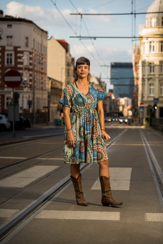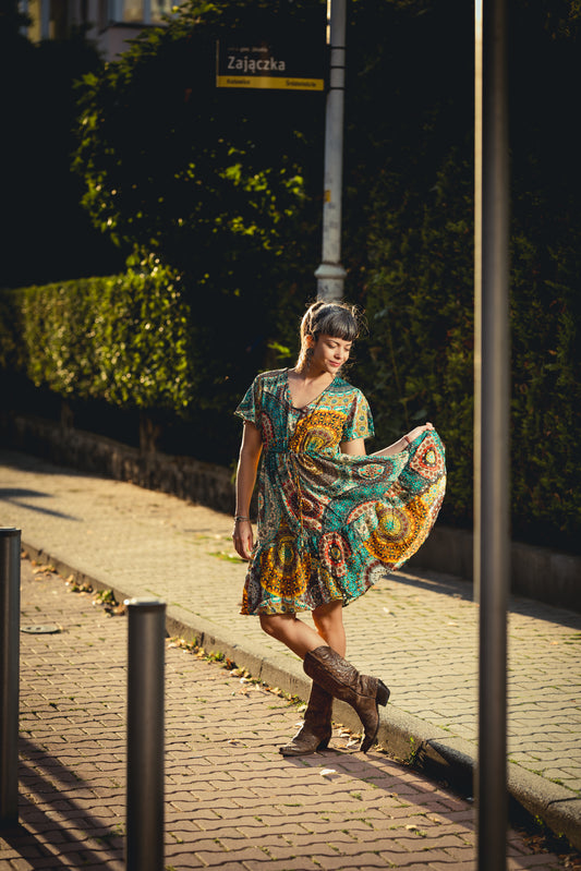 locker geschnittenes buntes Sommerkleid mit Ärmeln, bunt gelb türkis