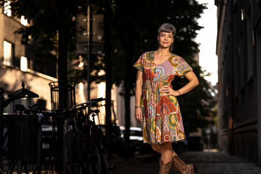 locker geschnittenes buntes Sommerkleid mit Ärmeln, rot bunt