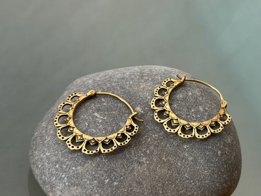 große verschnörkelte Creolen mit Spiralen und kleinen Pünktchen aus Messing