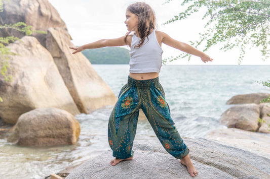 türkis orange gemusterte Pluderhose mit Pfauenmuster für Kinder