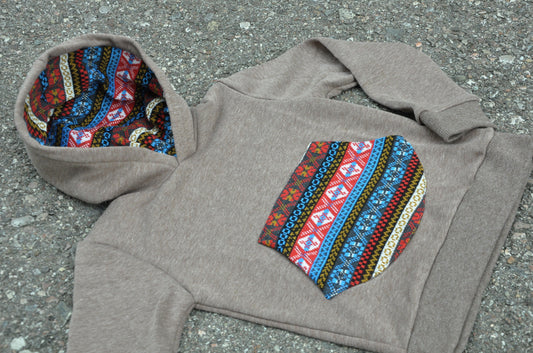 Kinder Pullover mit bunter Tasche und Kapuzenfutter braun