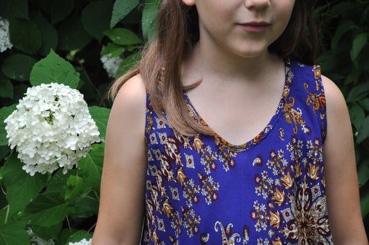 luftiges Elfenkleid für Kinder, rosa blau gemustertes Sommerkleid im Boho Look für Mädchen, Fransenkleid