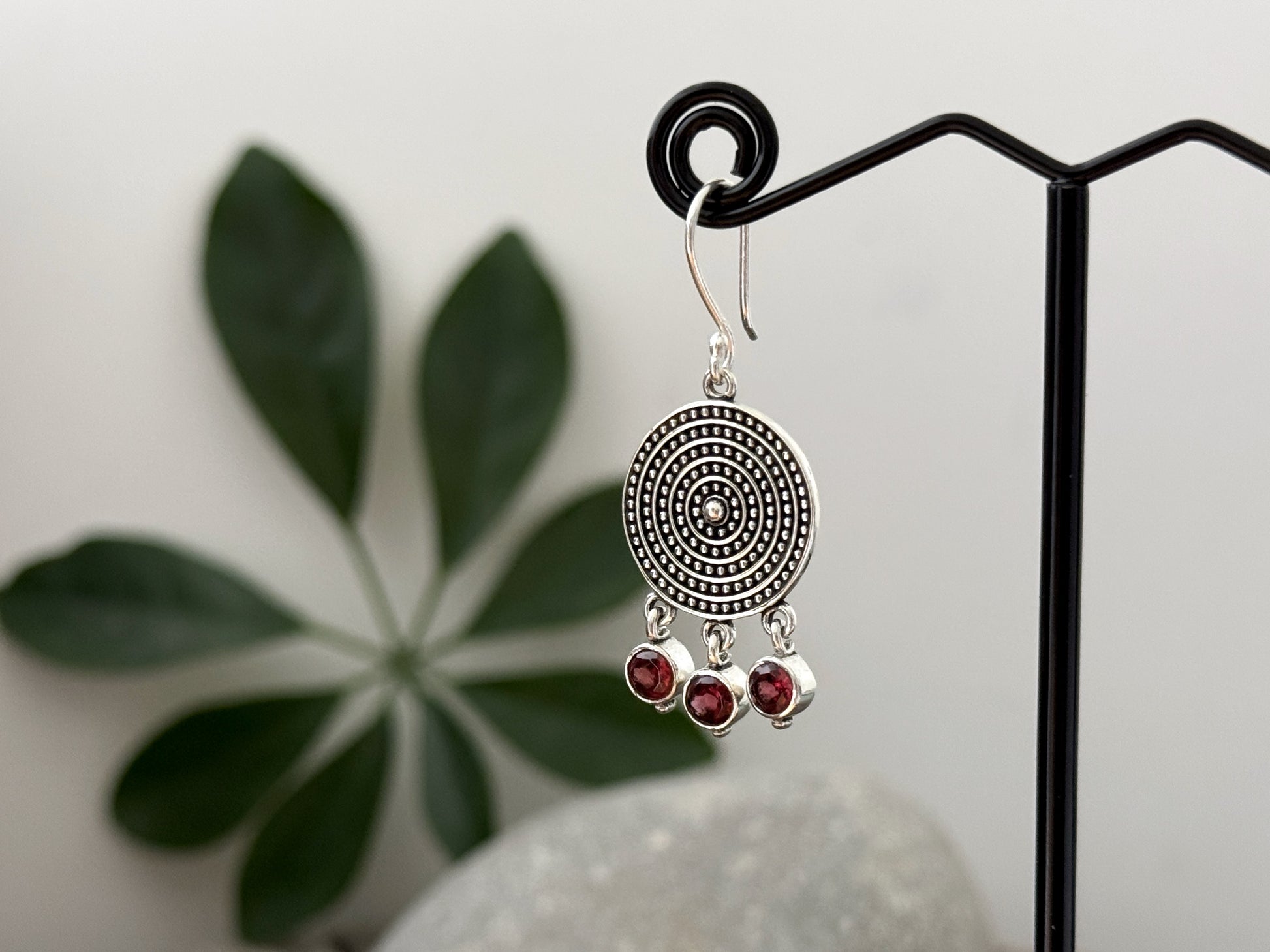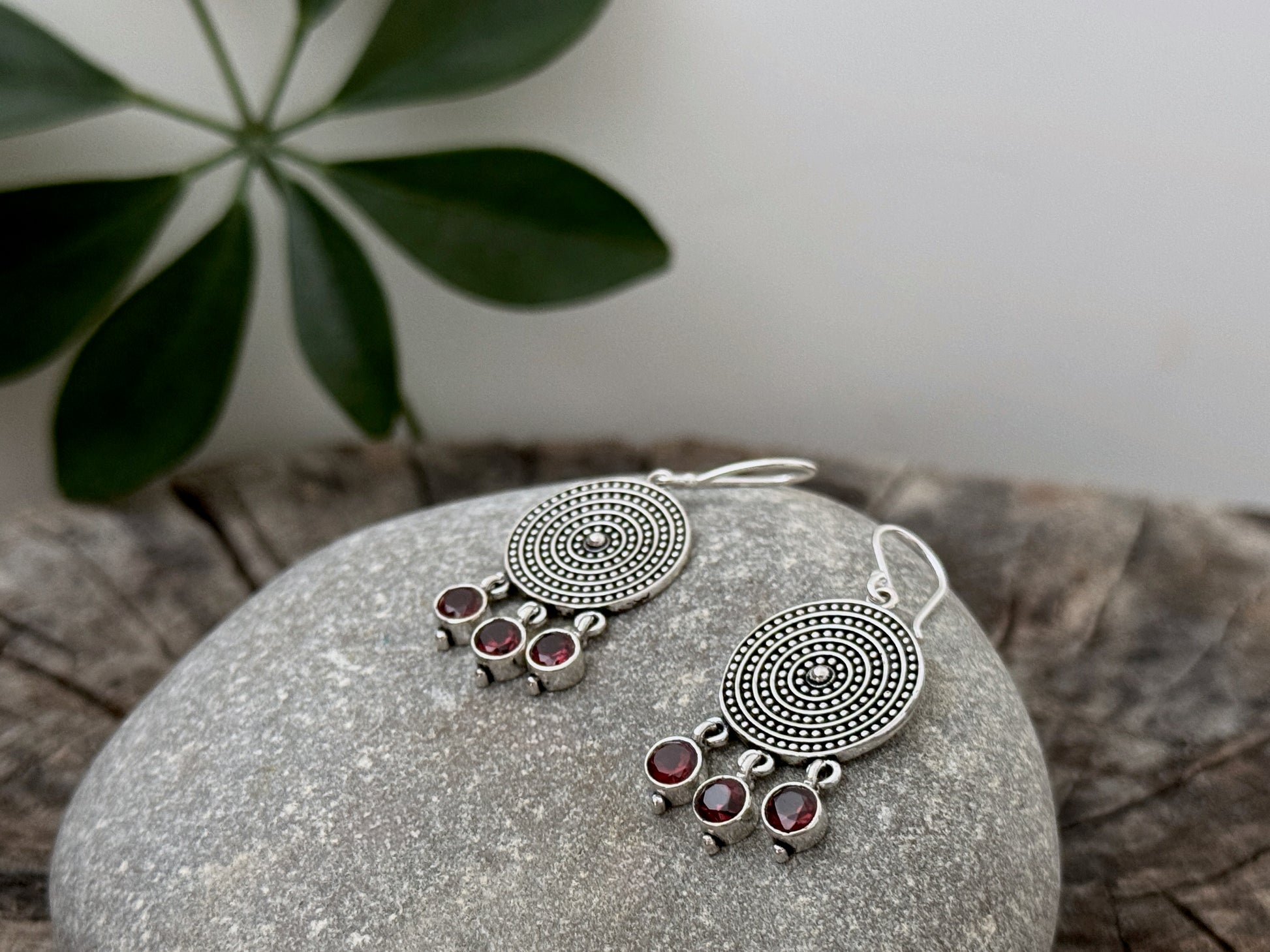 filigran verzierte, hängende Ohrringe mit 3 kleinen baumelnden roten Granat Steinen