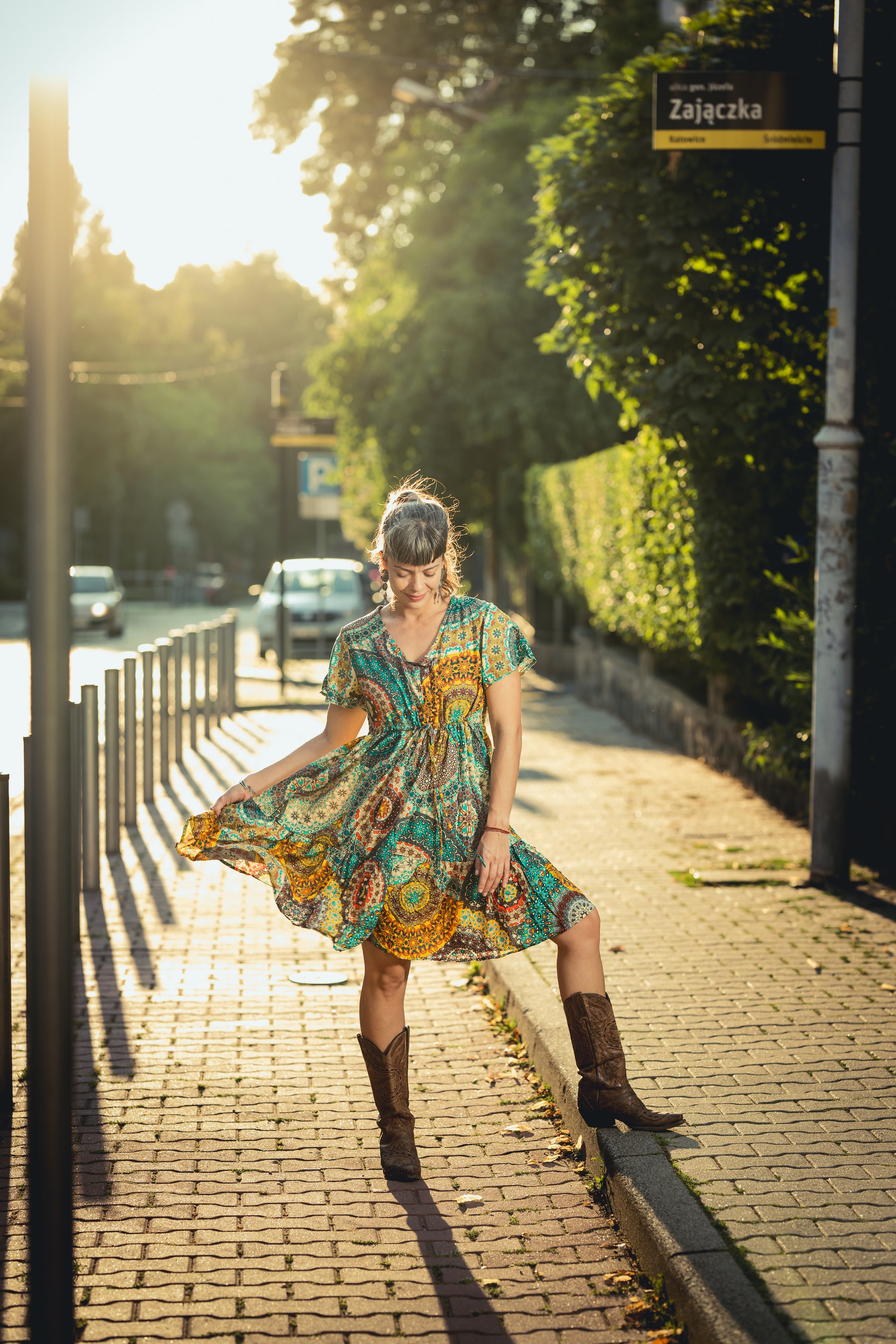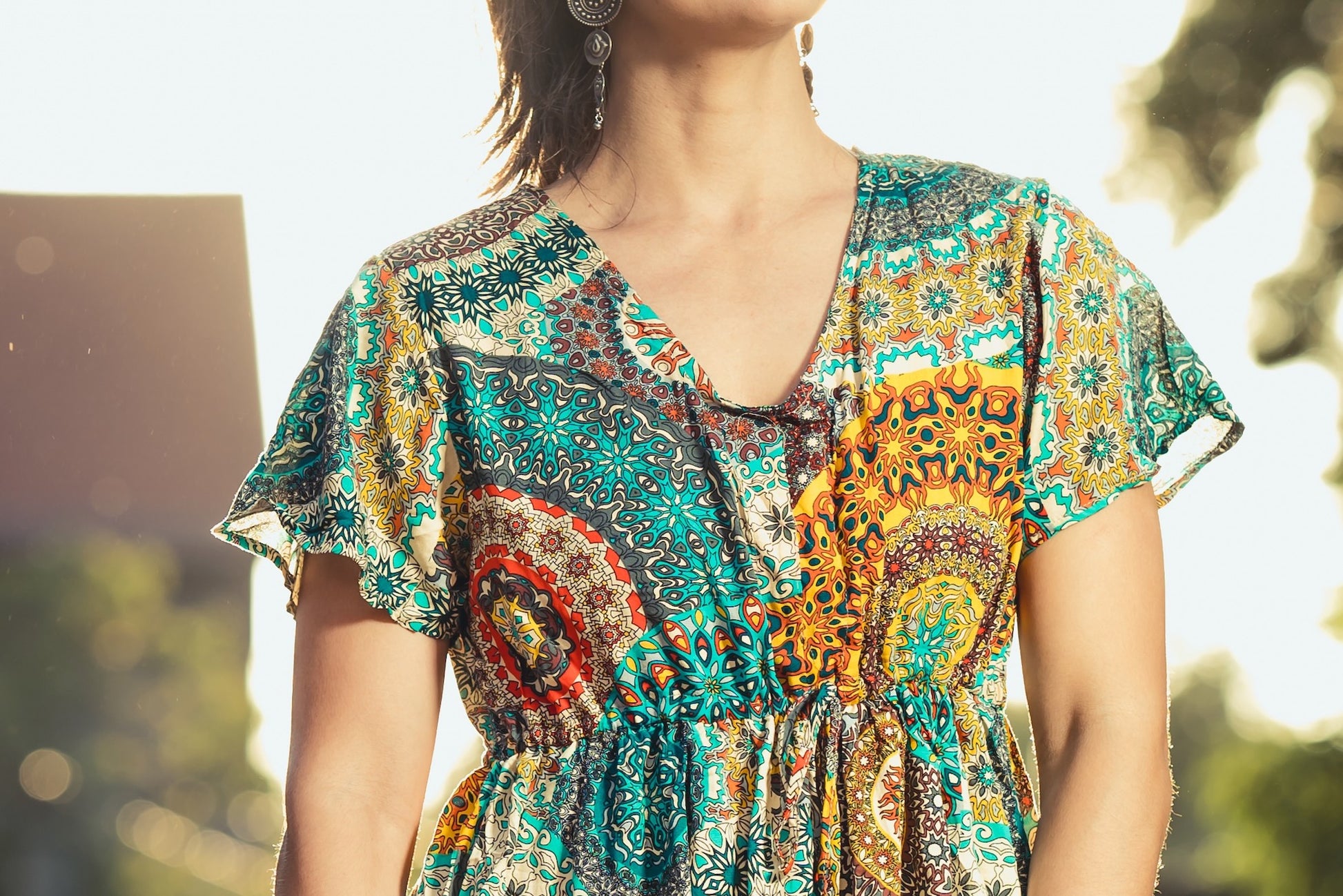 locker geschnittenes buntes Sommerkleid mit Ärmeln, bunt gelb türkis