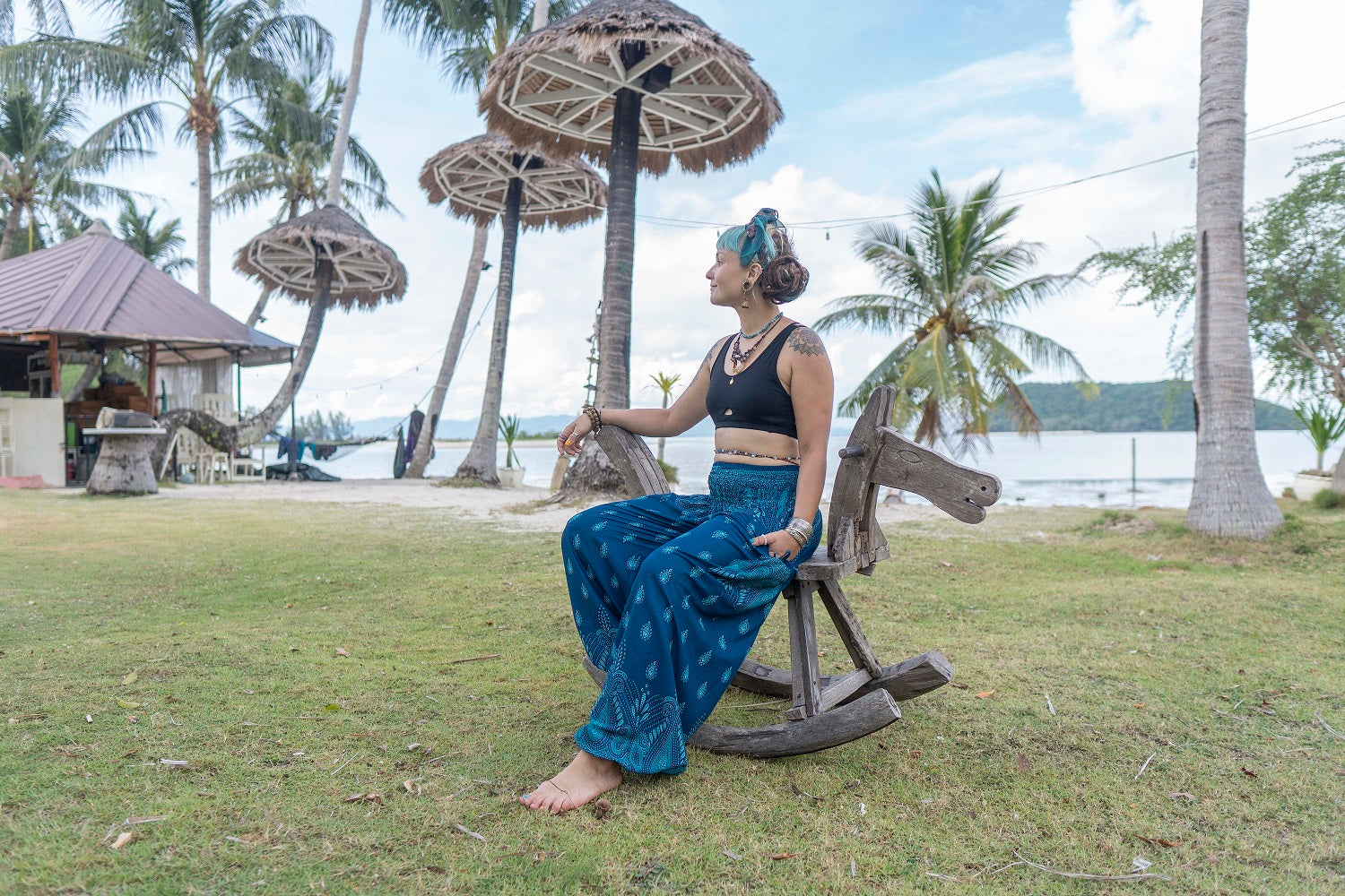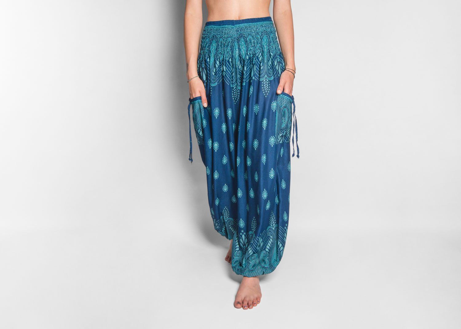 luftige gemusterte Pluderhose in türkis mit Taschen