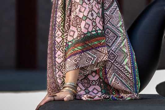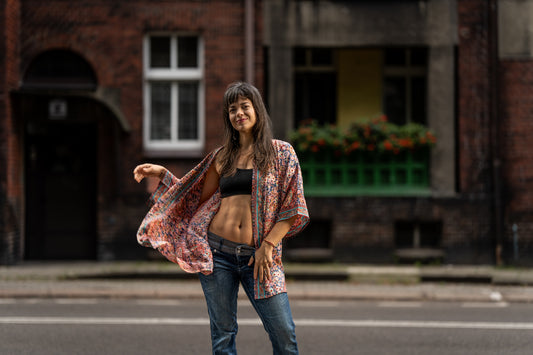 colorful patterned kimono, blouse, throw, light jacket in green, pink and light blue