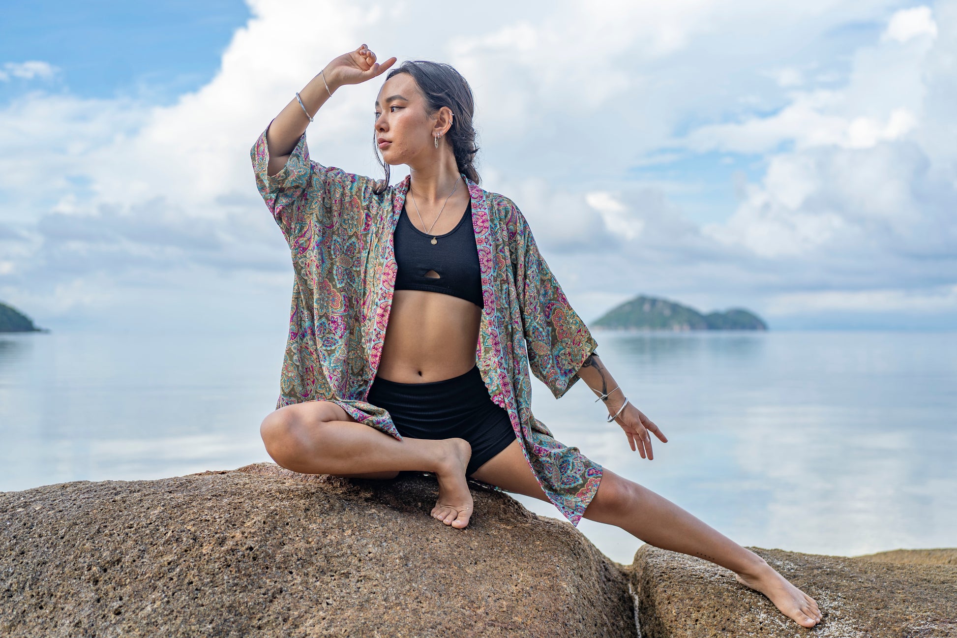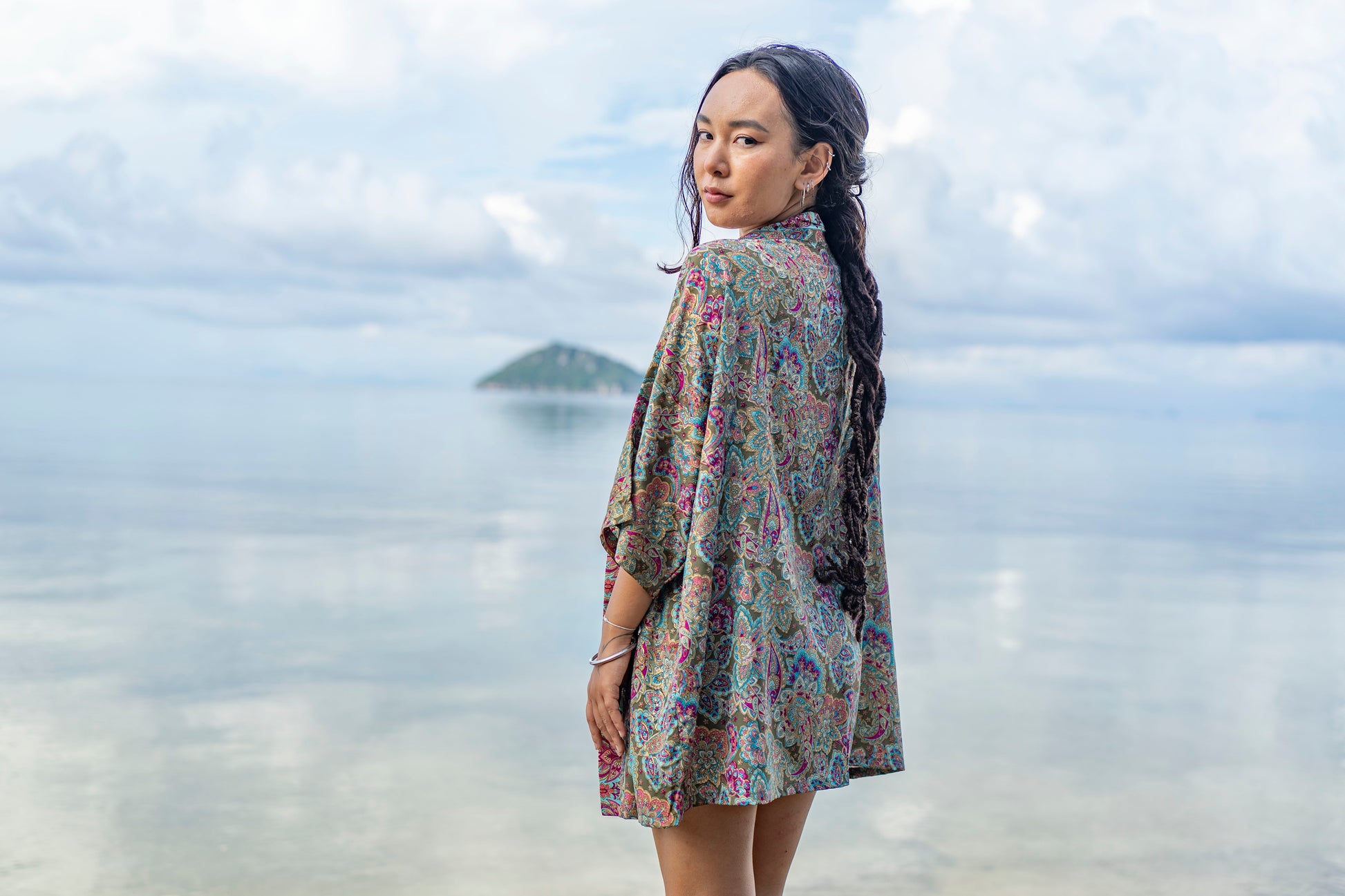 colorful patterned kimono, blouse, throw, light jacket in green, pink and light blue