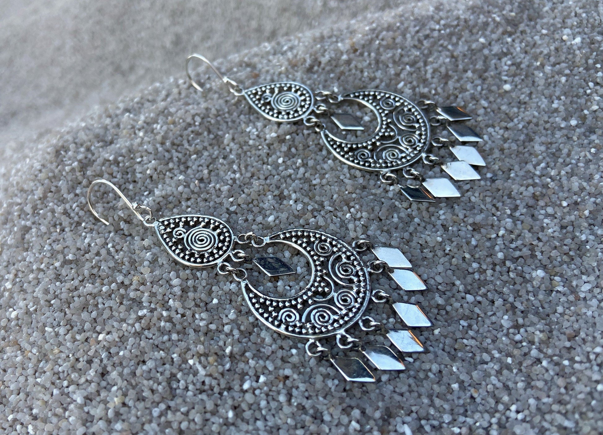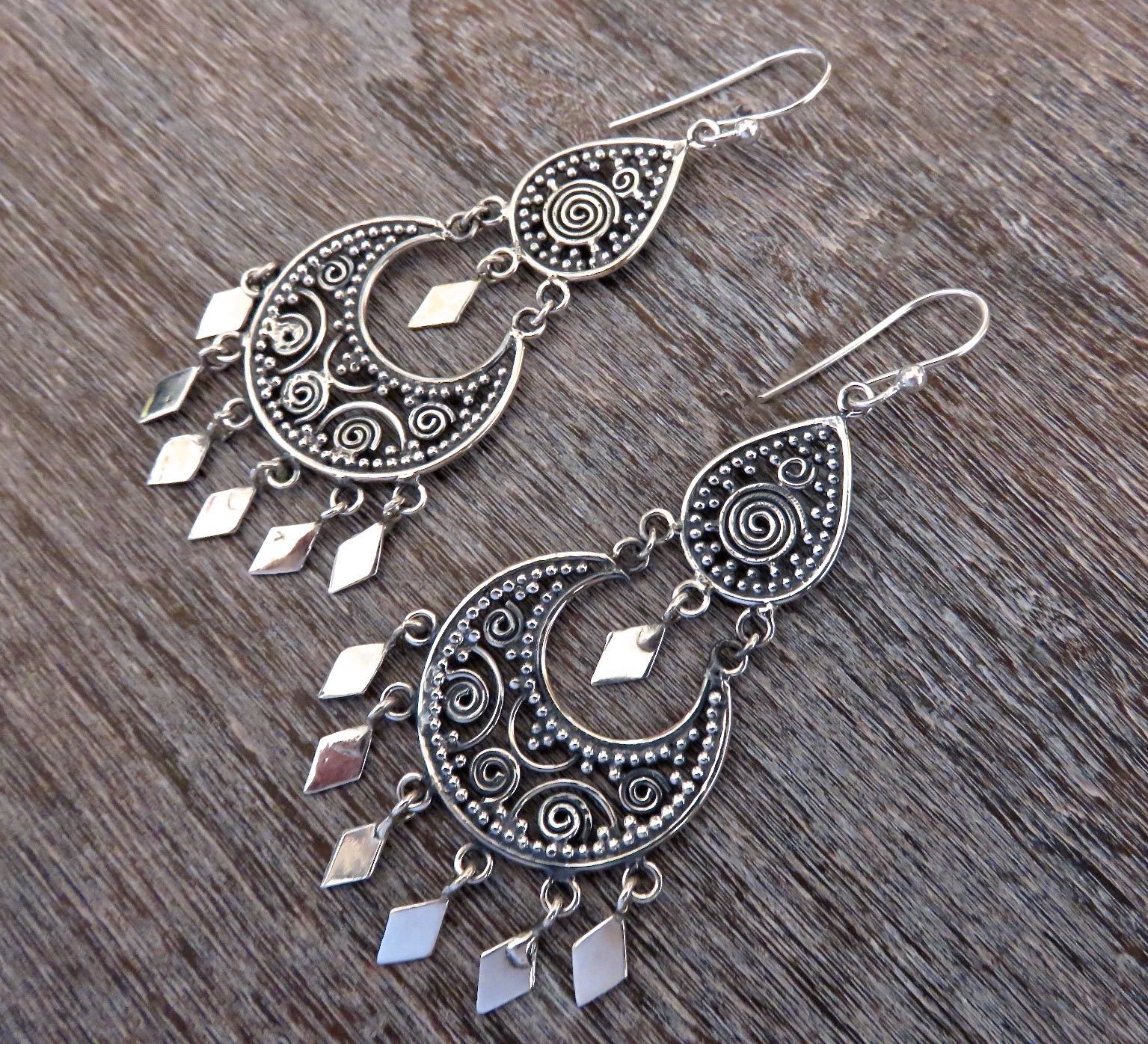 filigree hanging earrings with spirals, dots and dangling diamonds made of silver