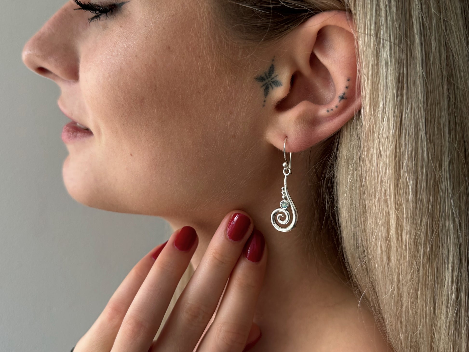 filigree hanging earrings with spirals, dots and dangling diamonds made of silver