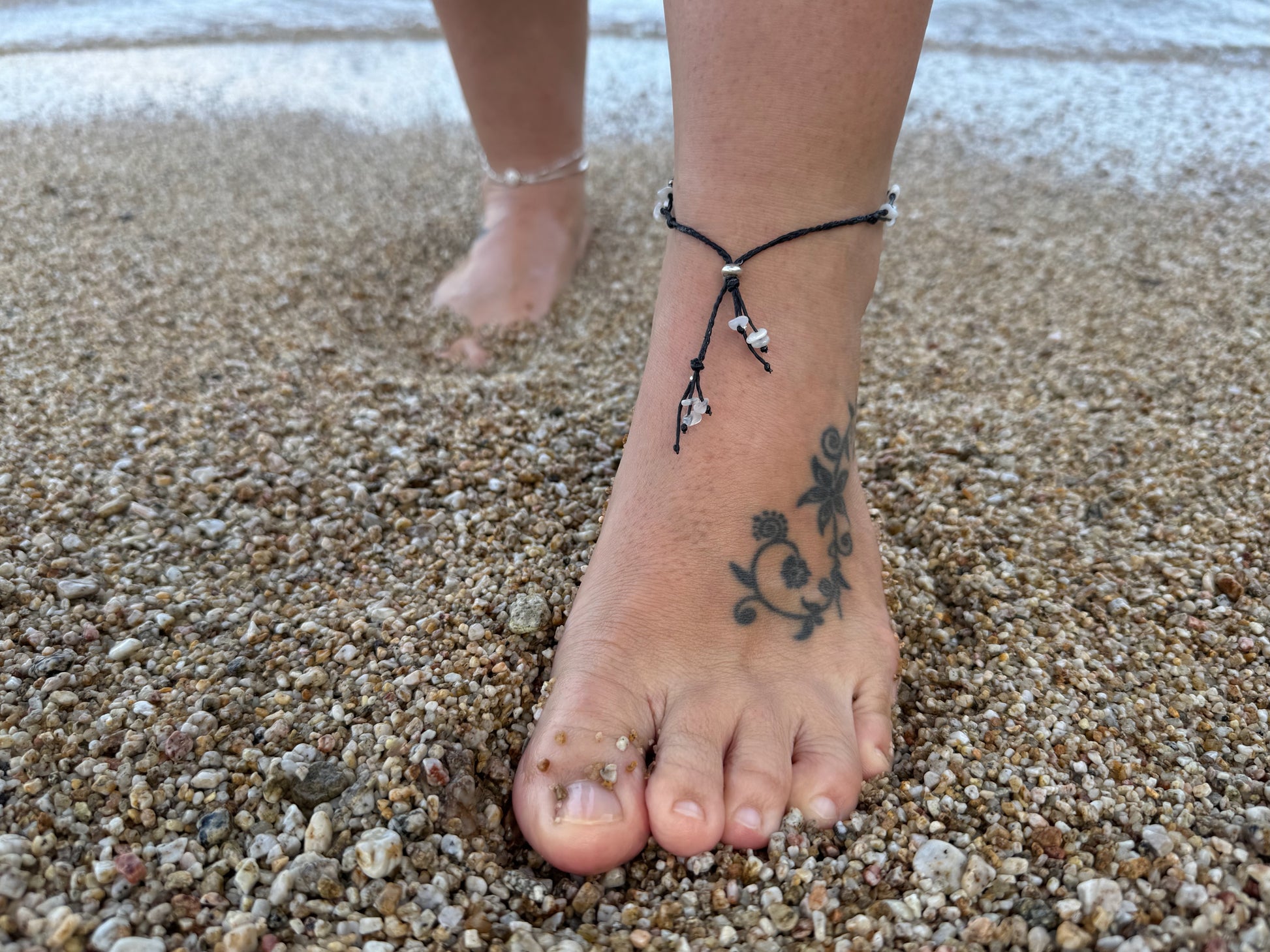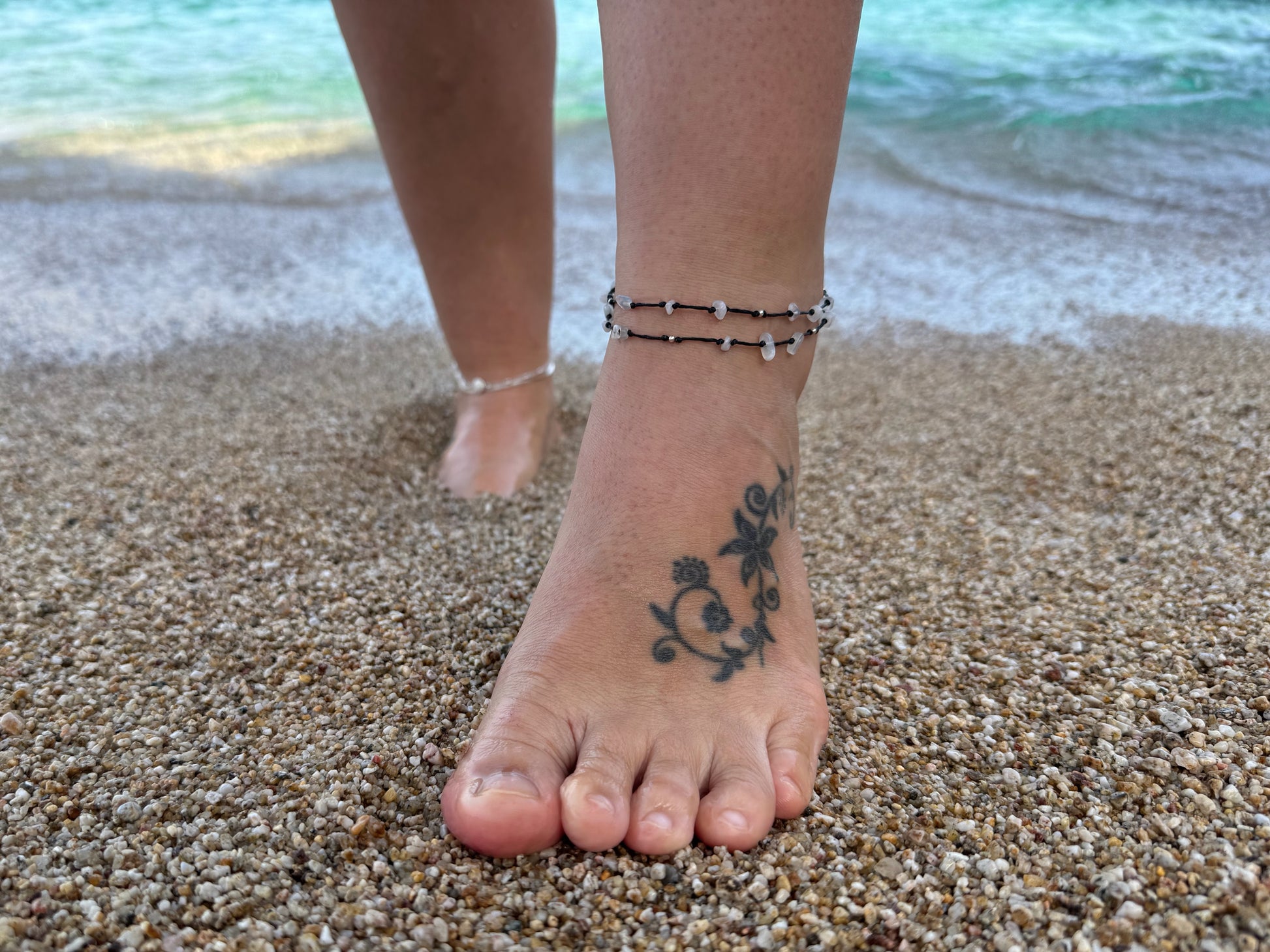 verstellbares, zweireihiges Fusskettchen mit kleinen Mondsteinen und Silberperlen, welches auch am Oberarm getragen werden kann