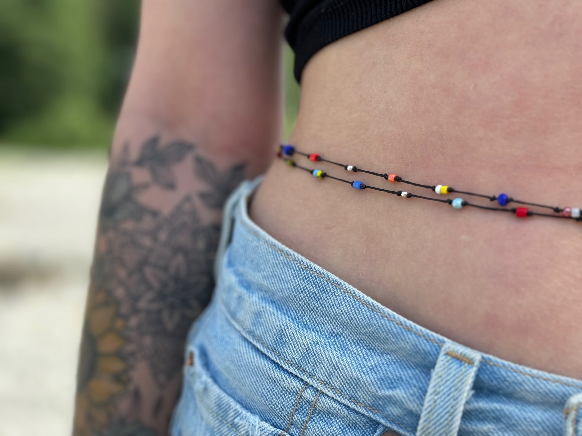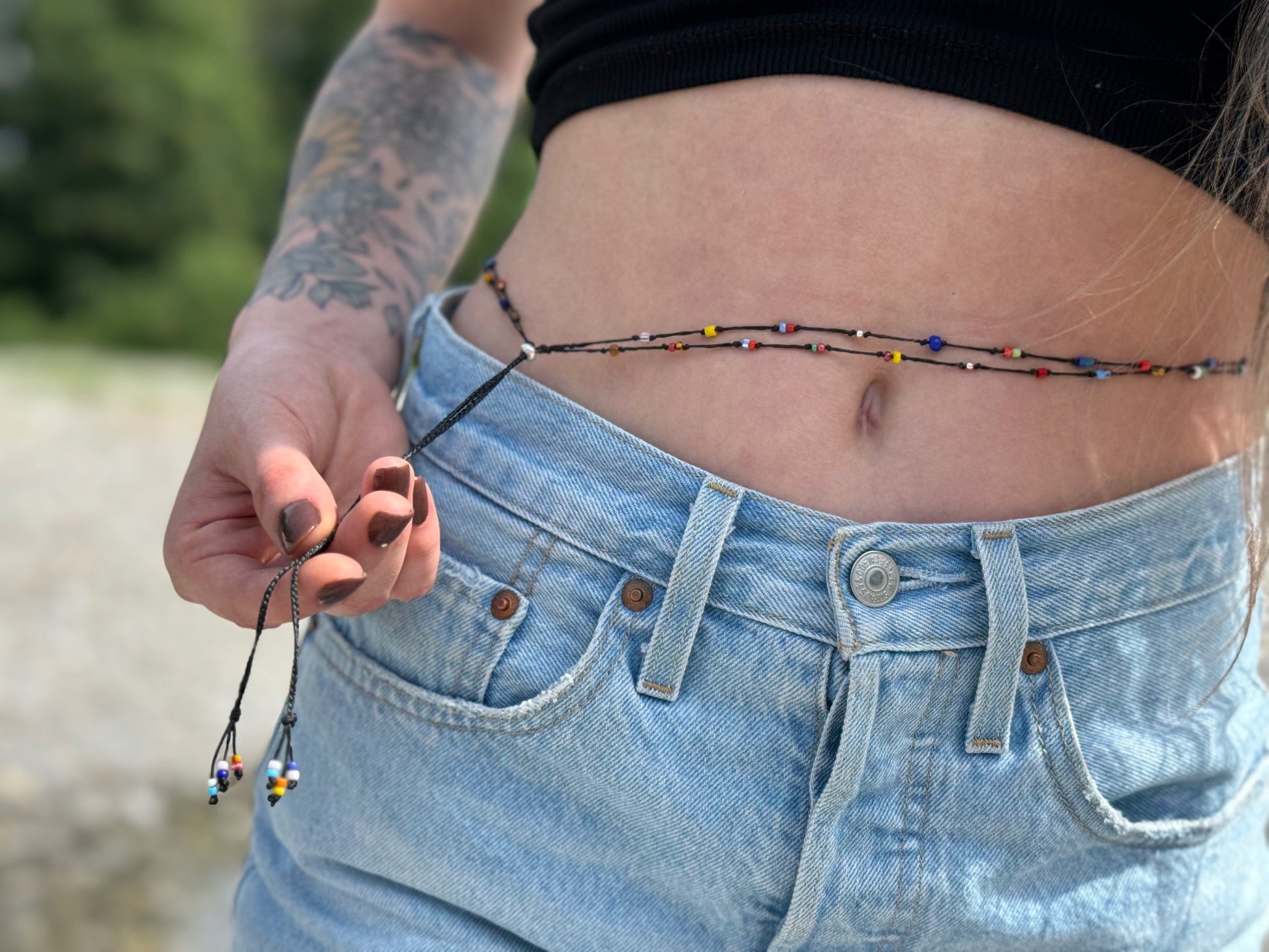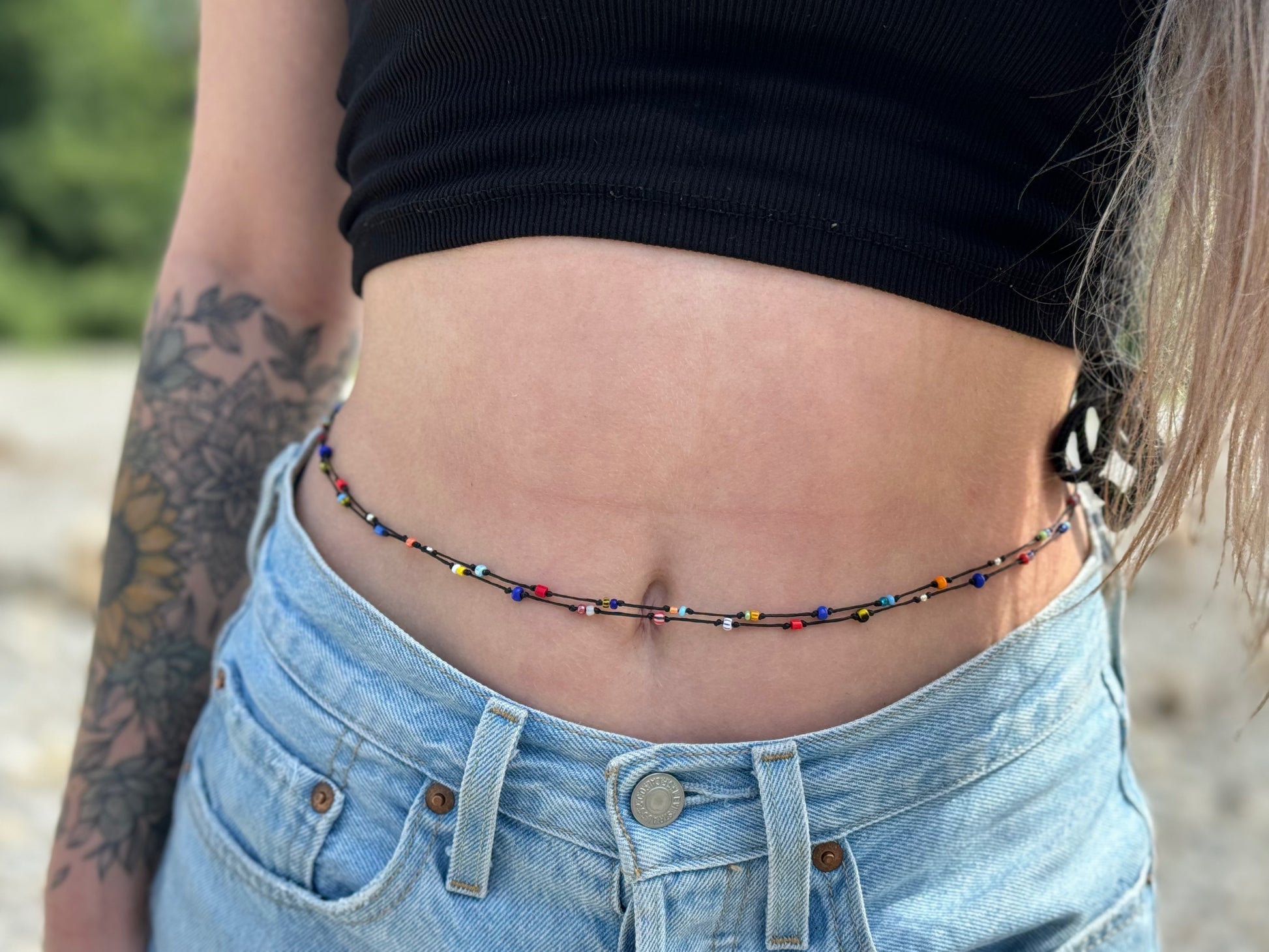 Belly chain with black beads and brass spirals, hip chain, belly jewelry
