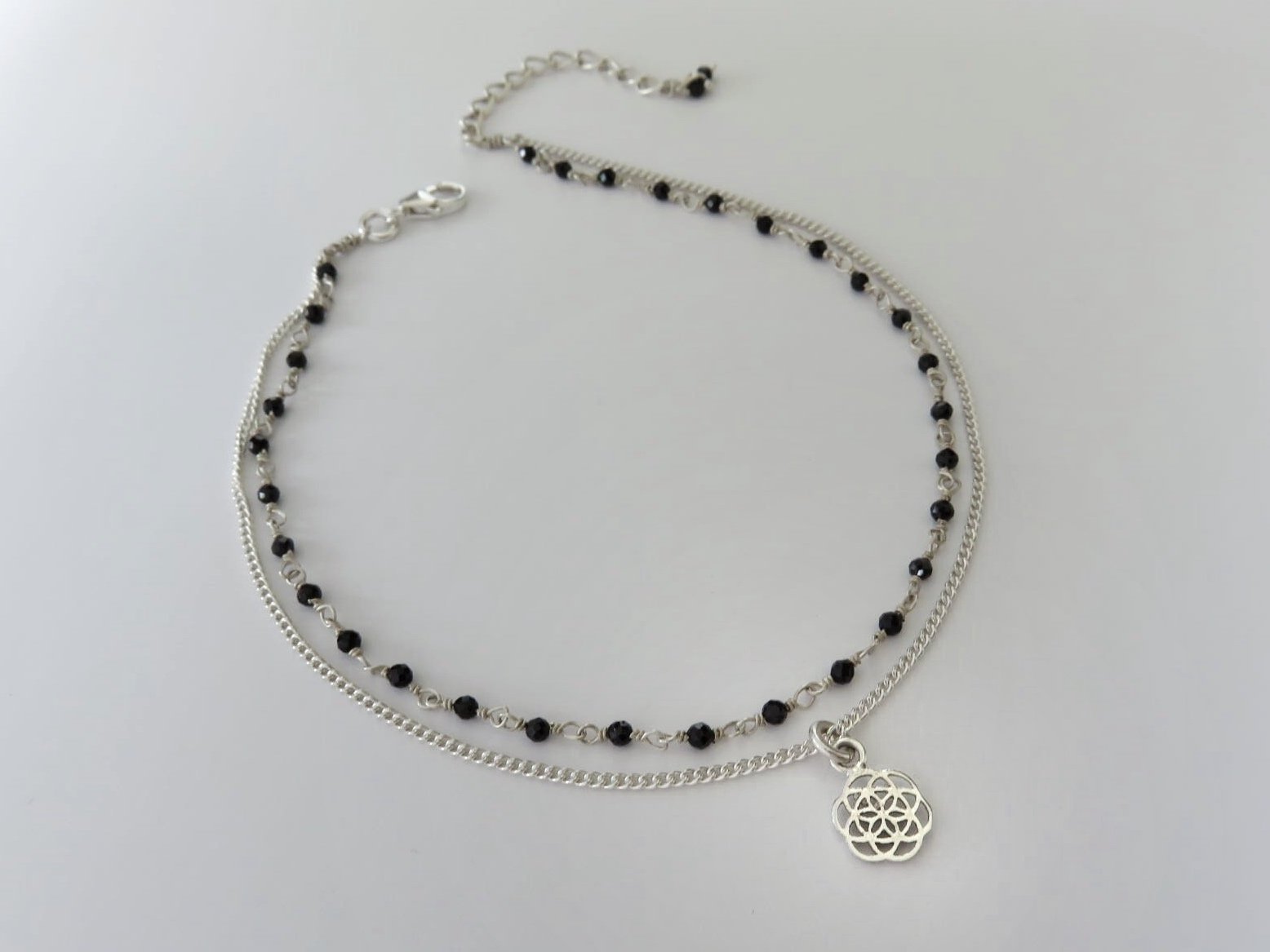 double row anklet with small black spinel stones, pendant with the Seed of Life motif and extension chain