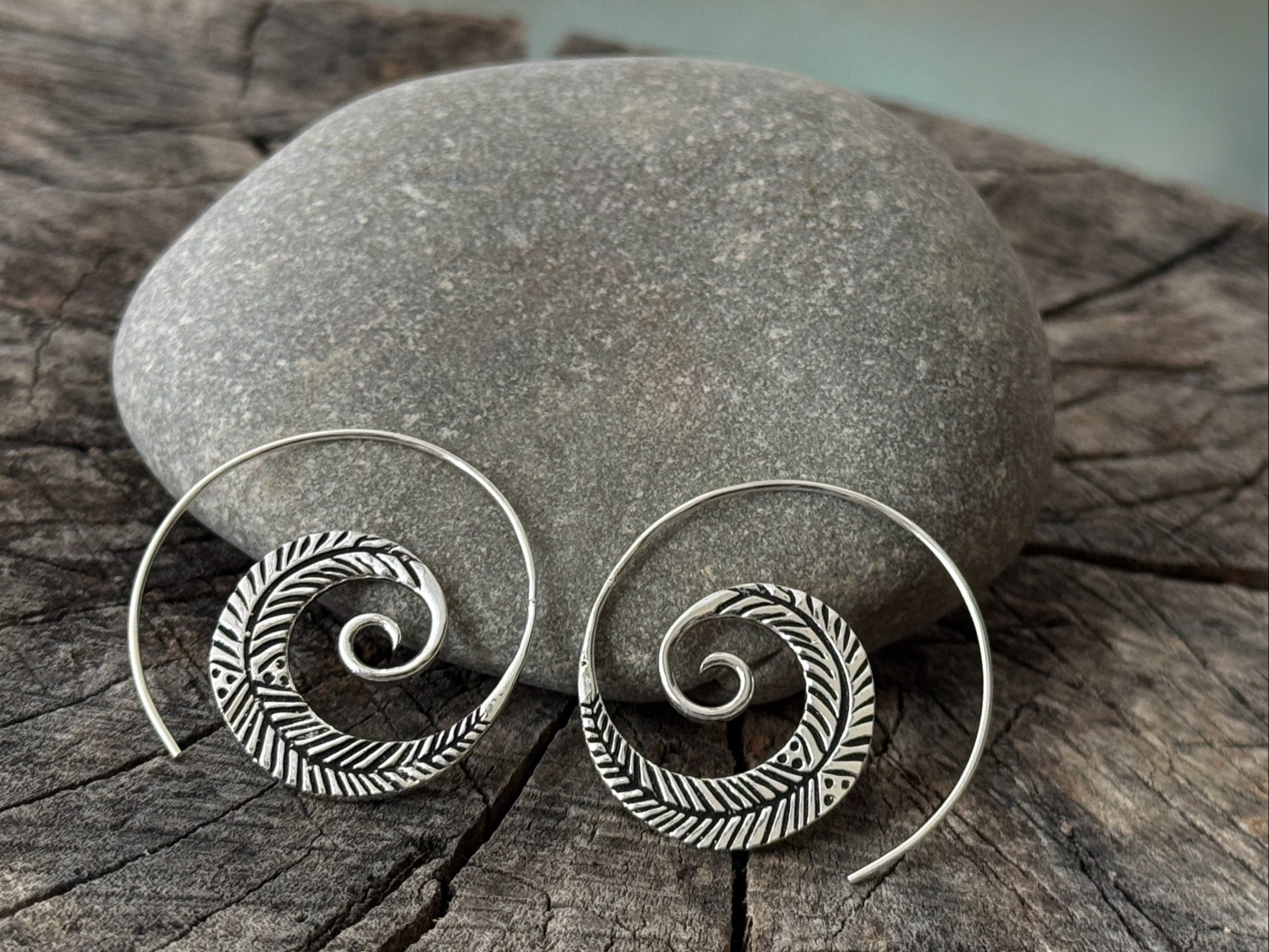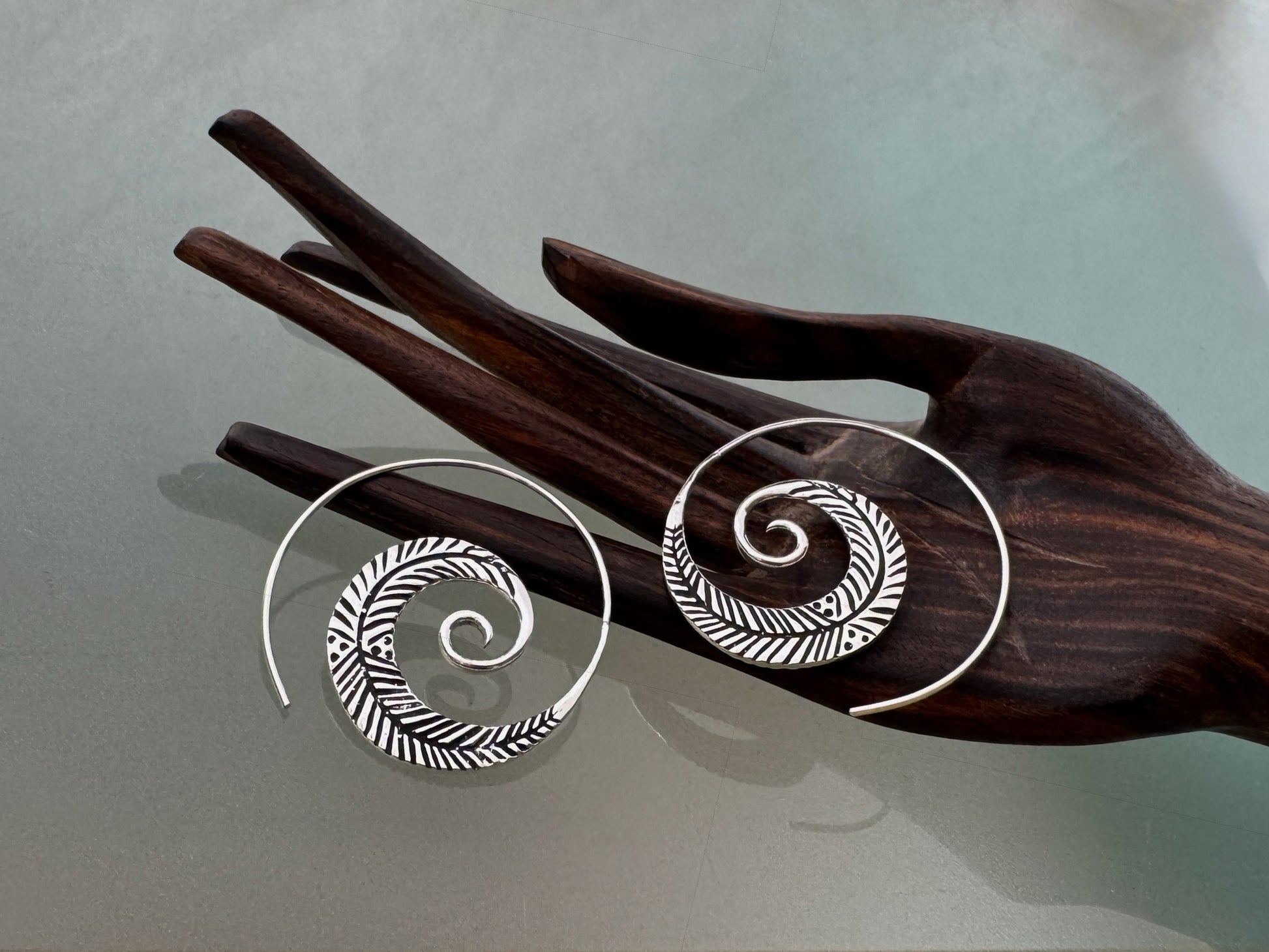 grosse Spiral Ohrringe mit beidseitigem, detailliertem Blättermuster aus Silber