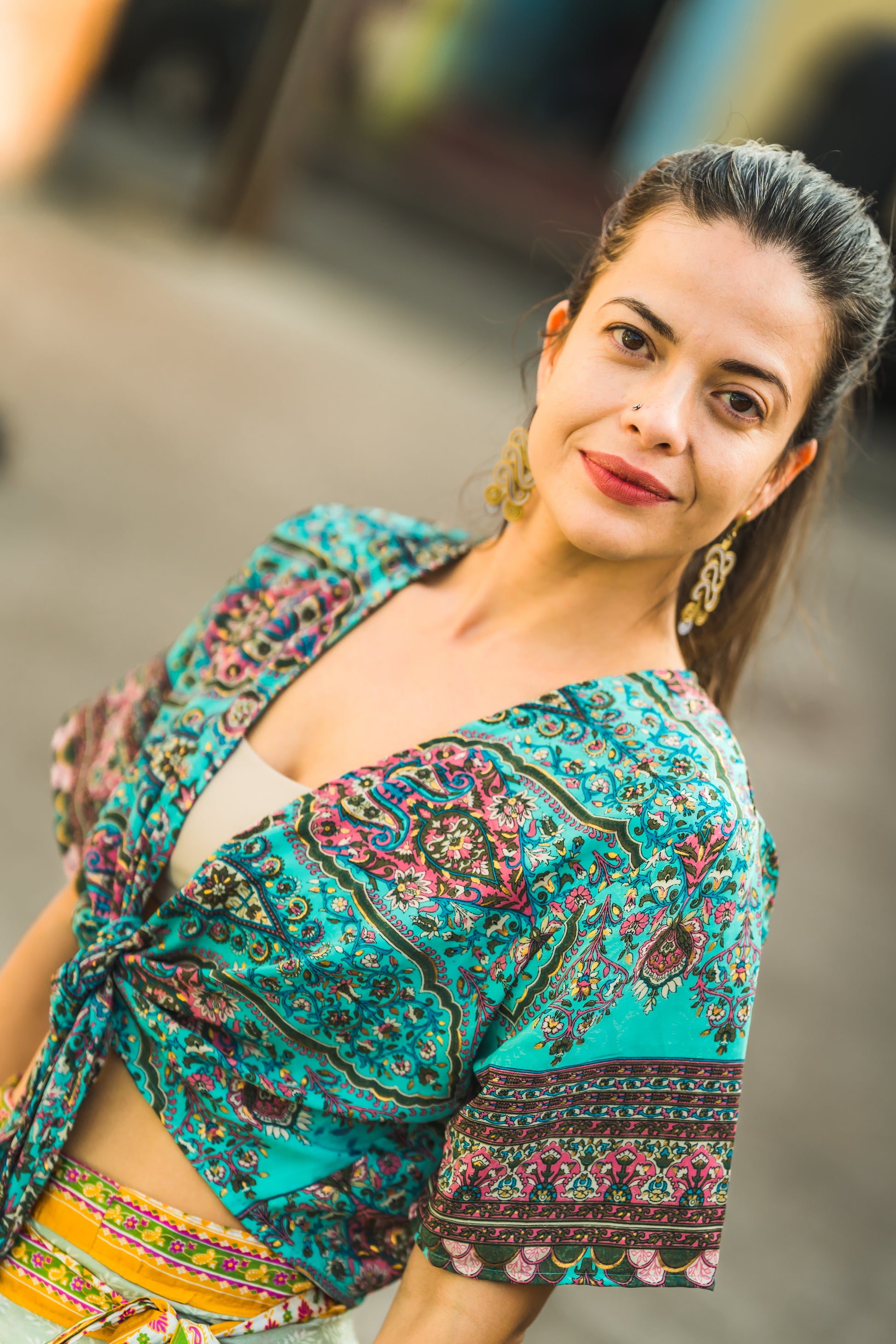 kurzer Kimono zum Binden, Bluse, Sommerbluse, Überwurf, türkis bunt gemustert
