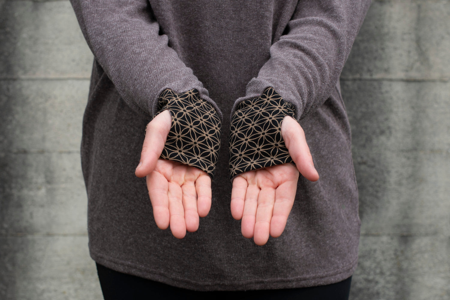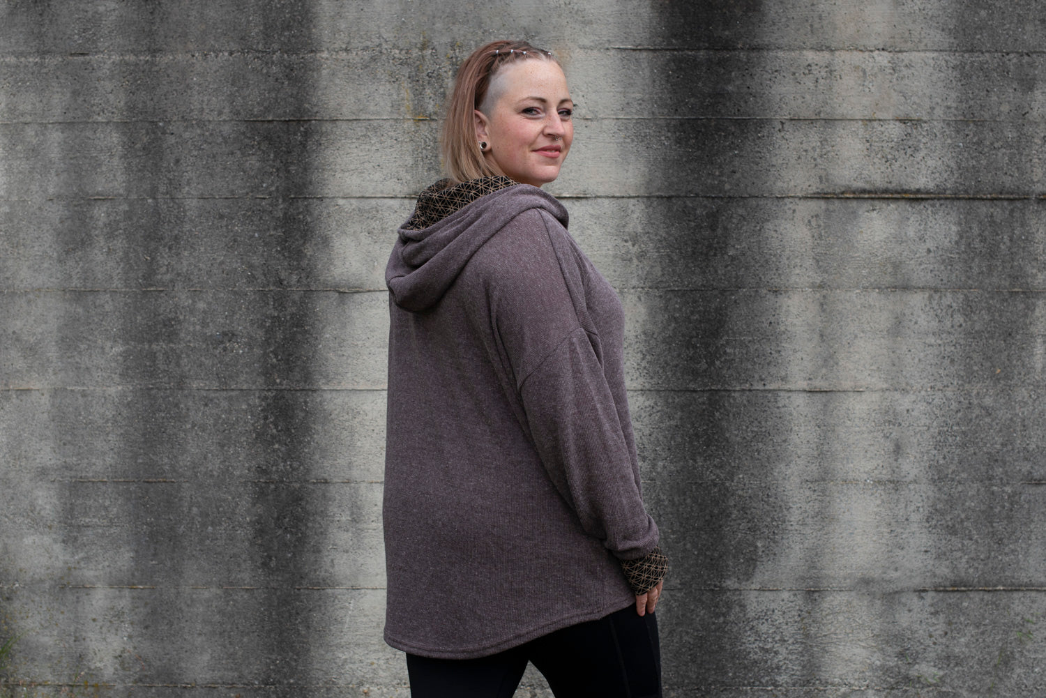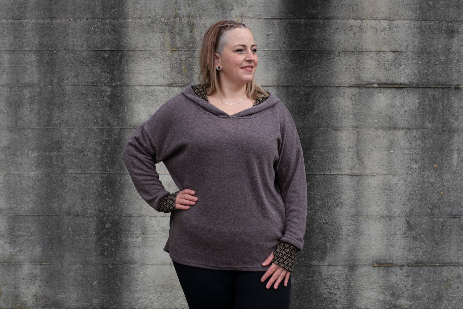 loose, comfortable hoodie in brown with thumb hole. A color-matching fabric with the pattern of the flower of life is incorporated into the hood.