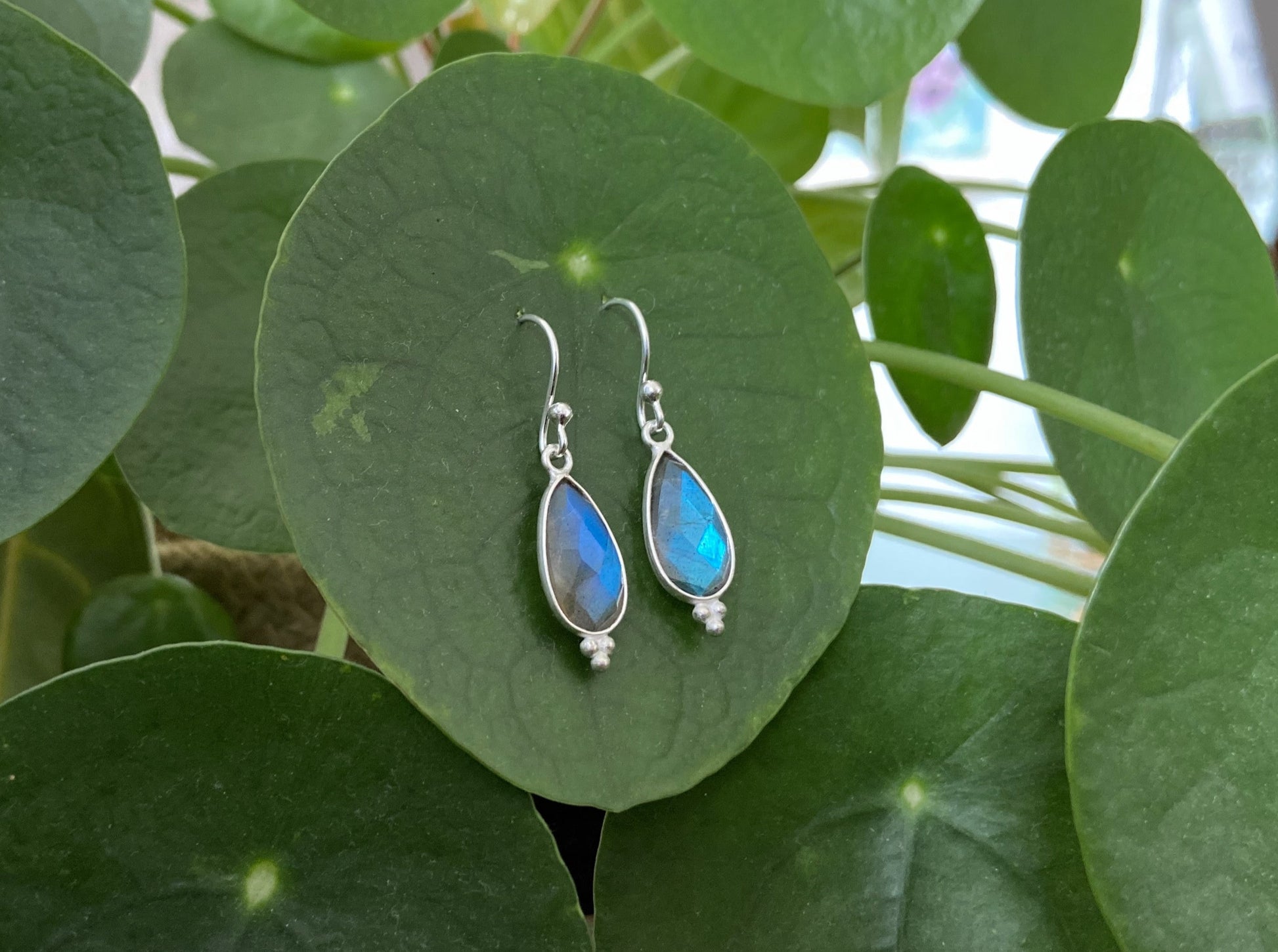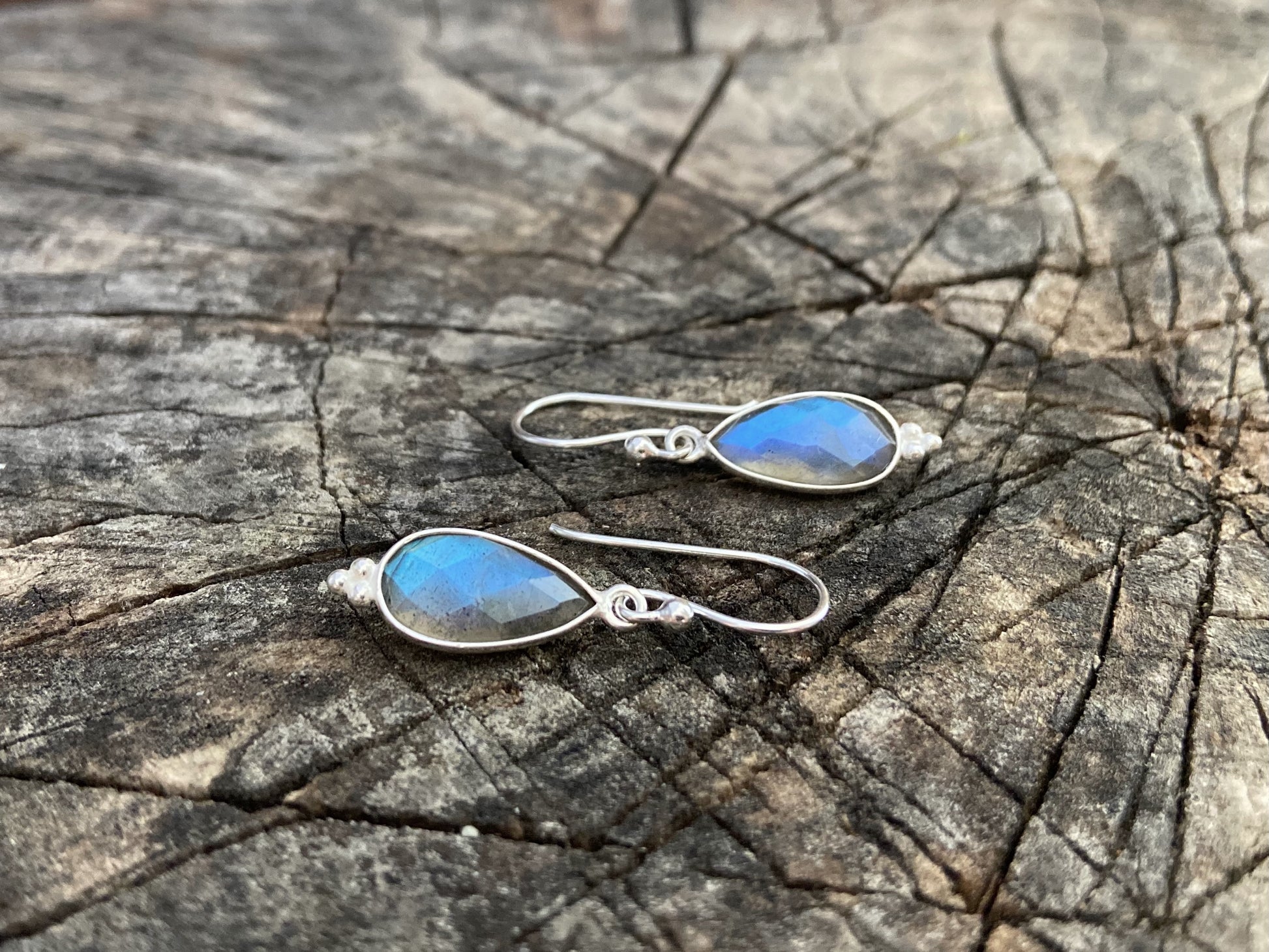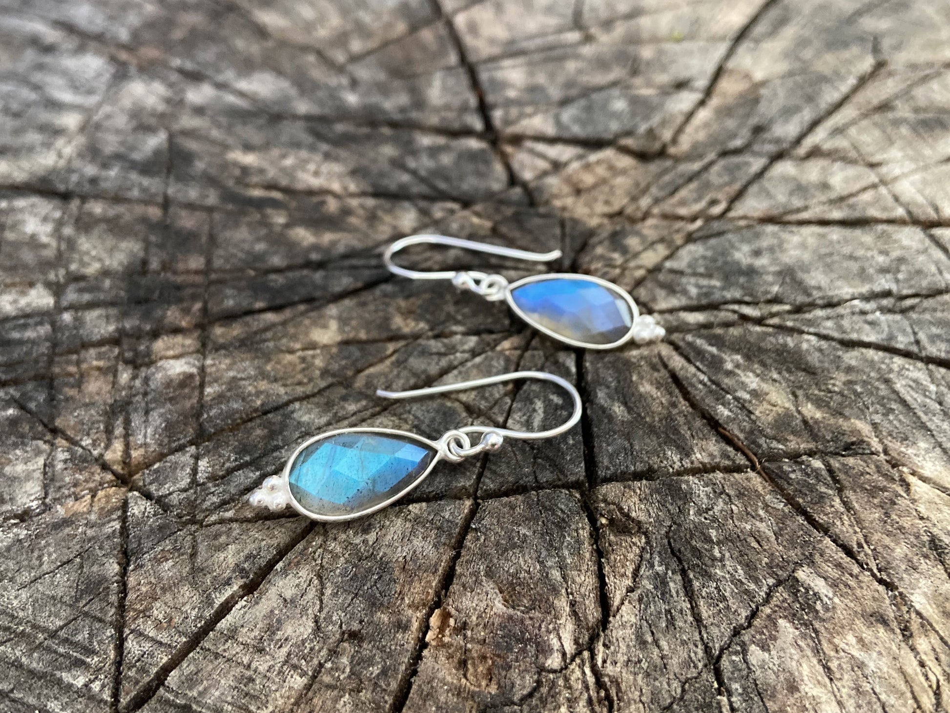 Simple earrings made of silver with faceted labradorite stone in the shape of a teardrop