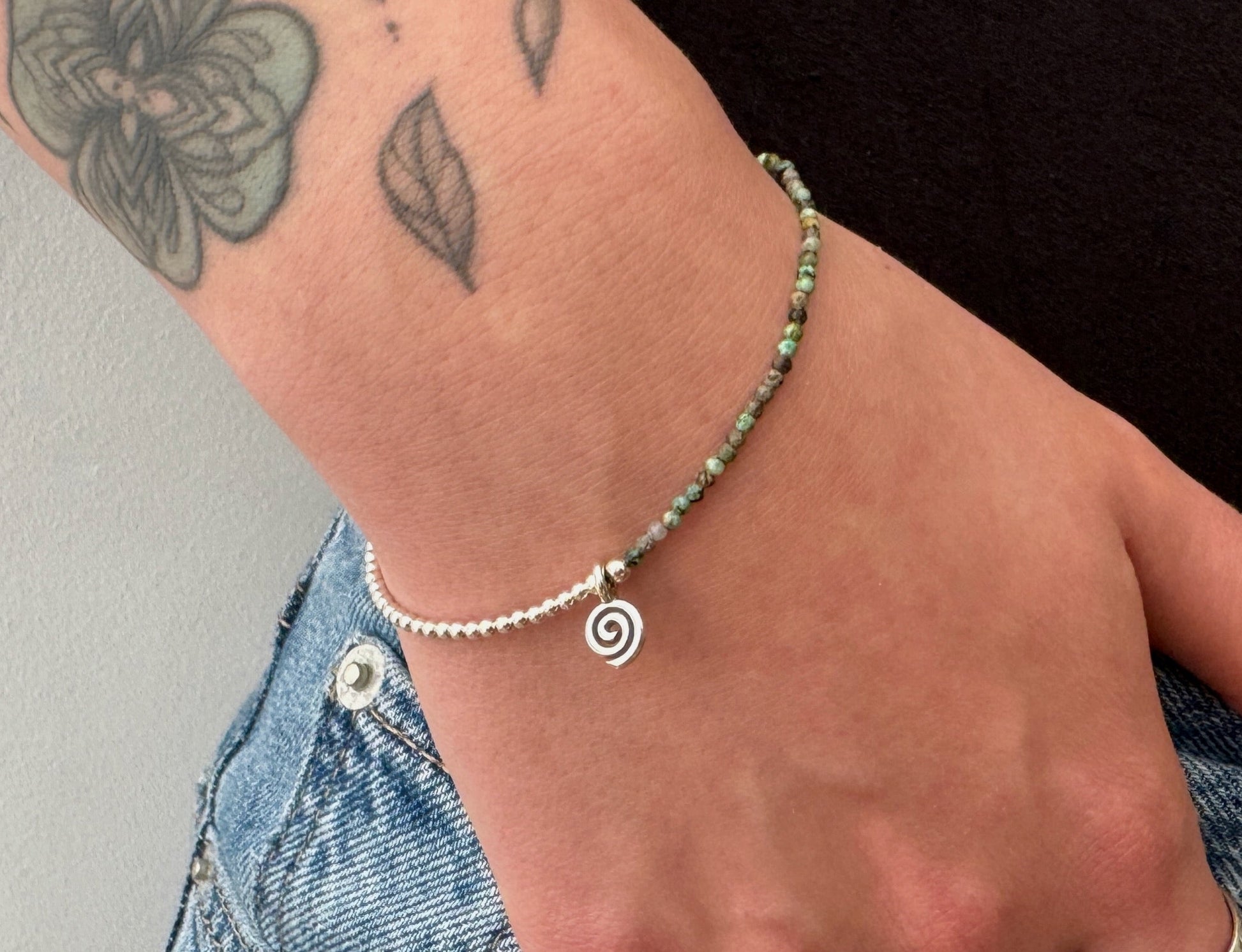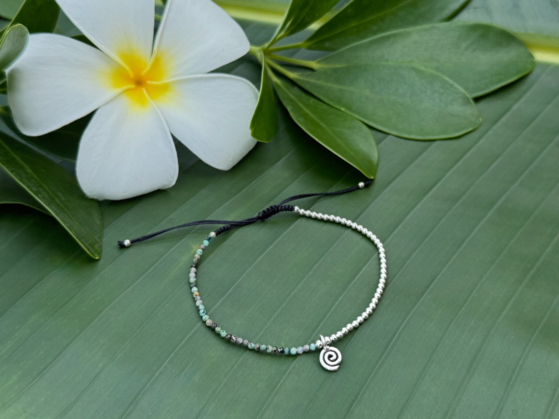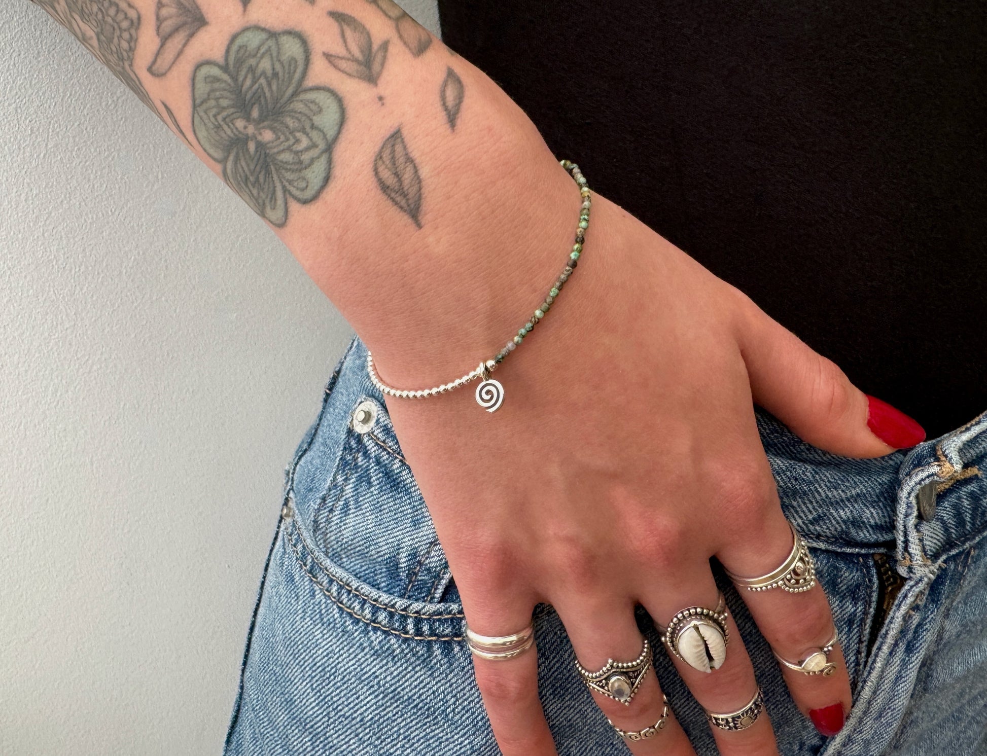 verstellbares Armband mit Spirale, silbernen Kügelchen und Türkis Steinchen