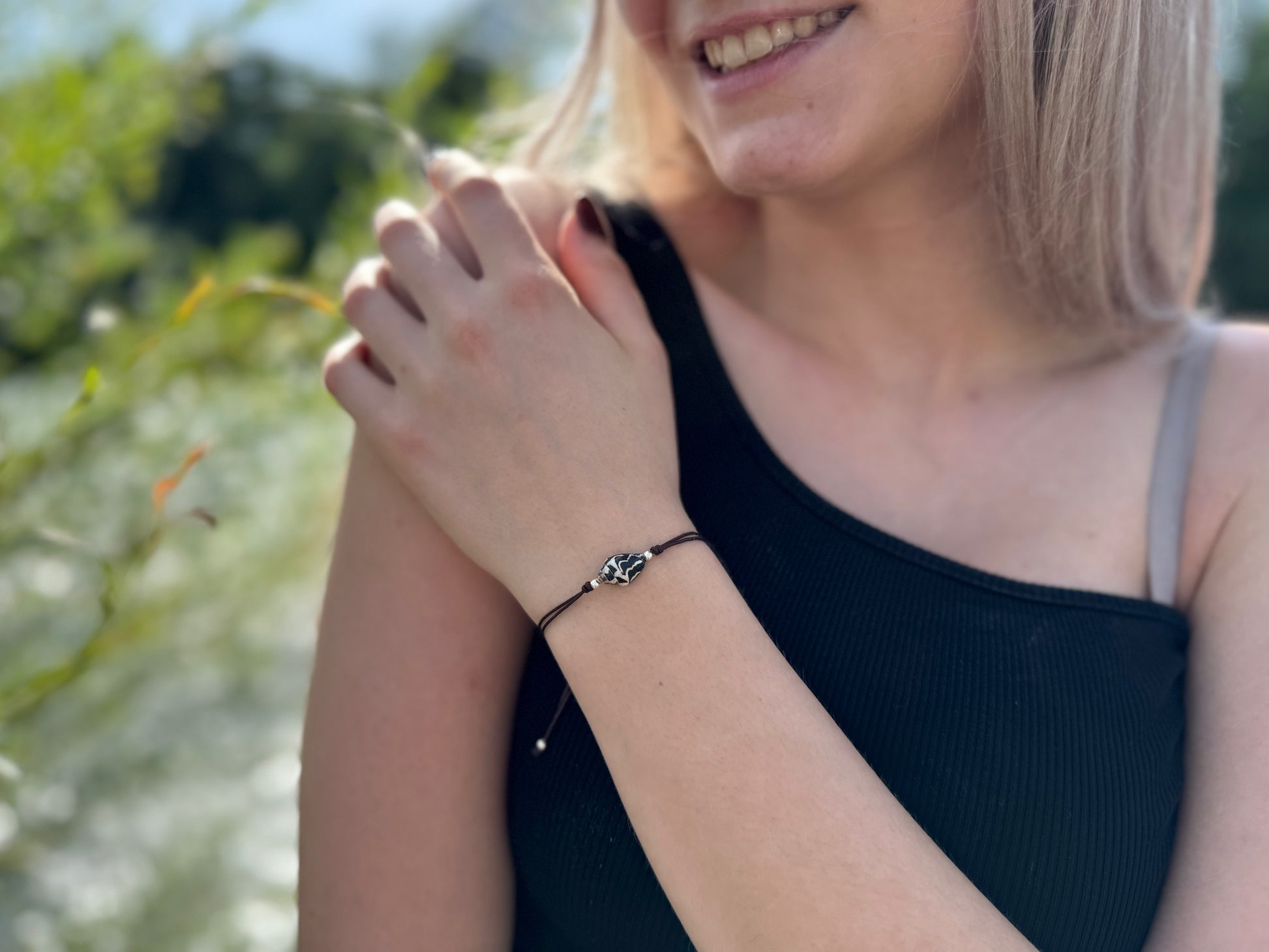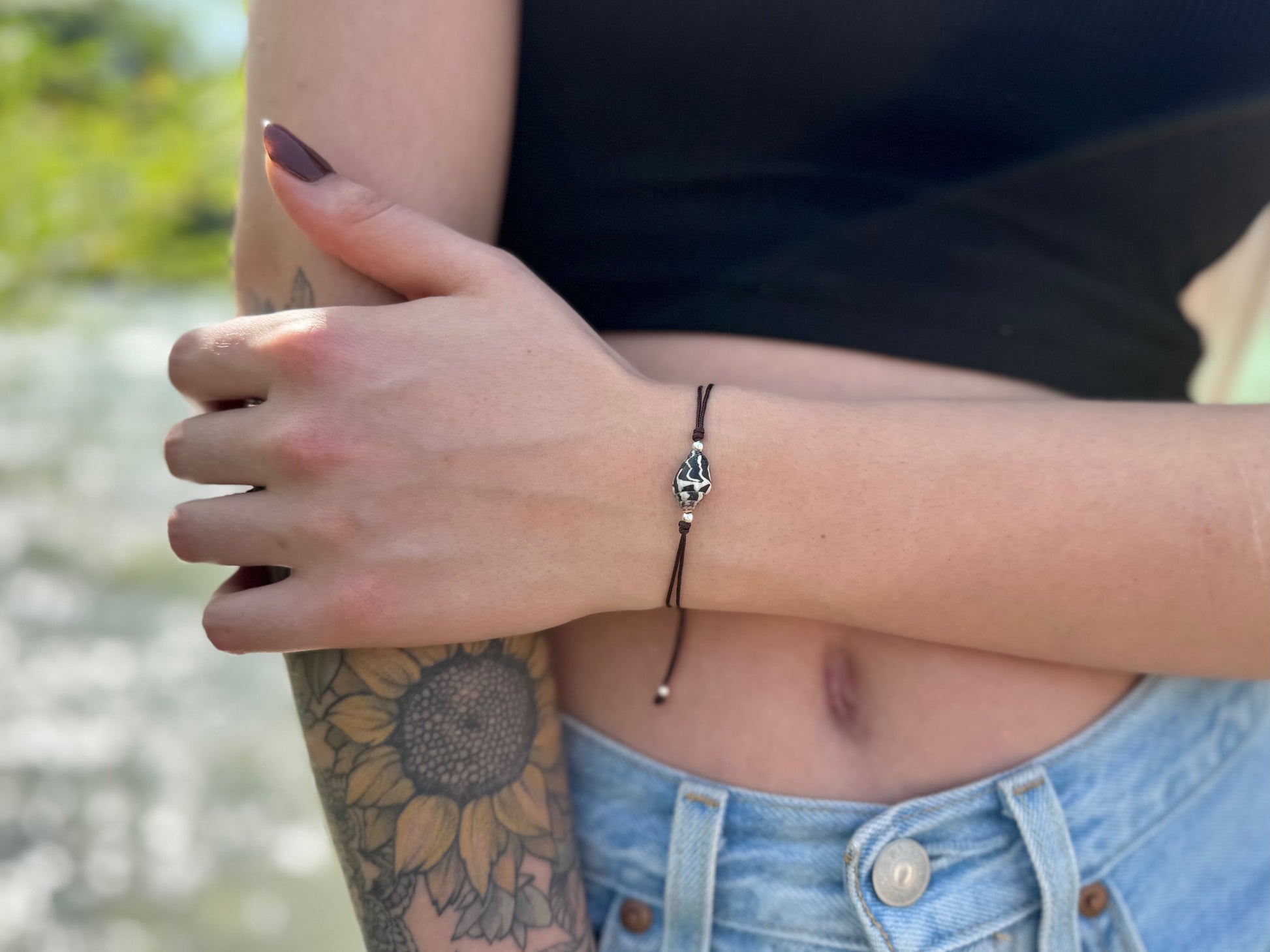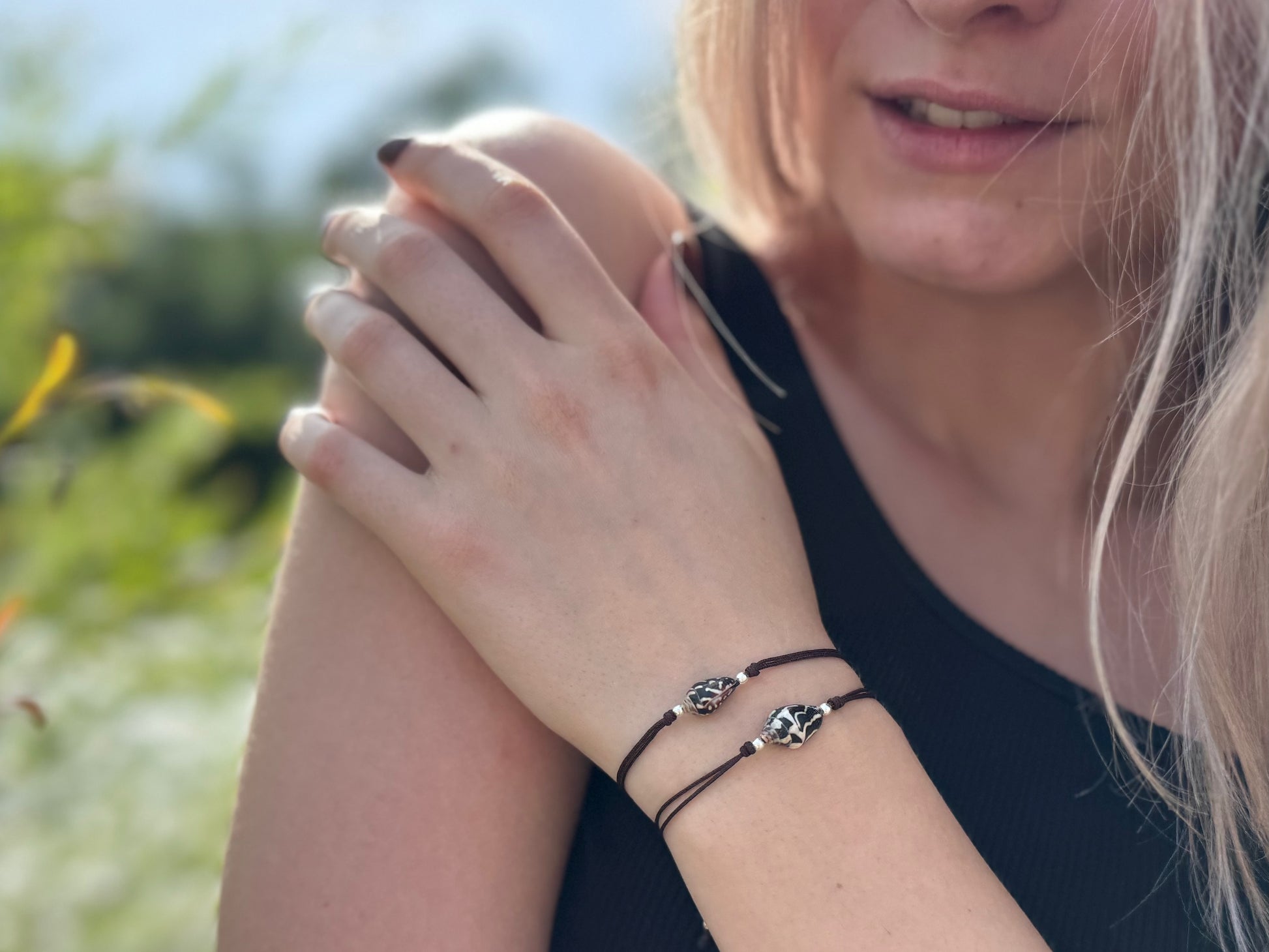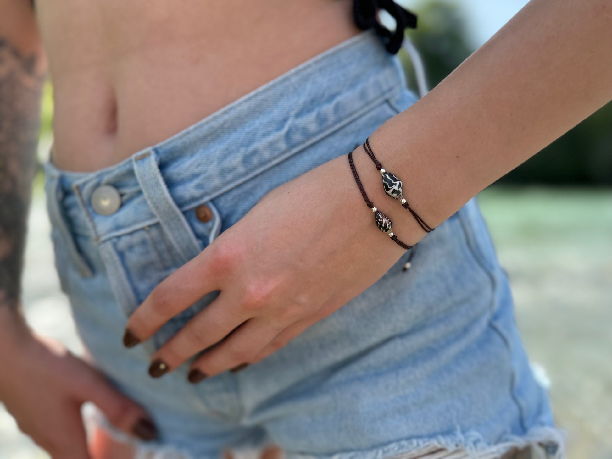 verstellbares, braunes Armband mit kleiner Muschel und Silberkügelchen.