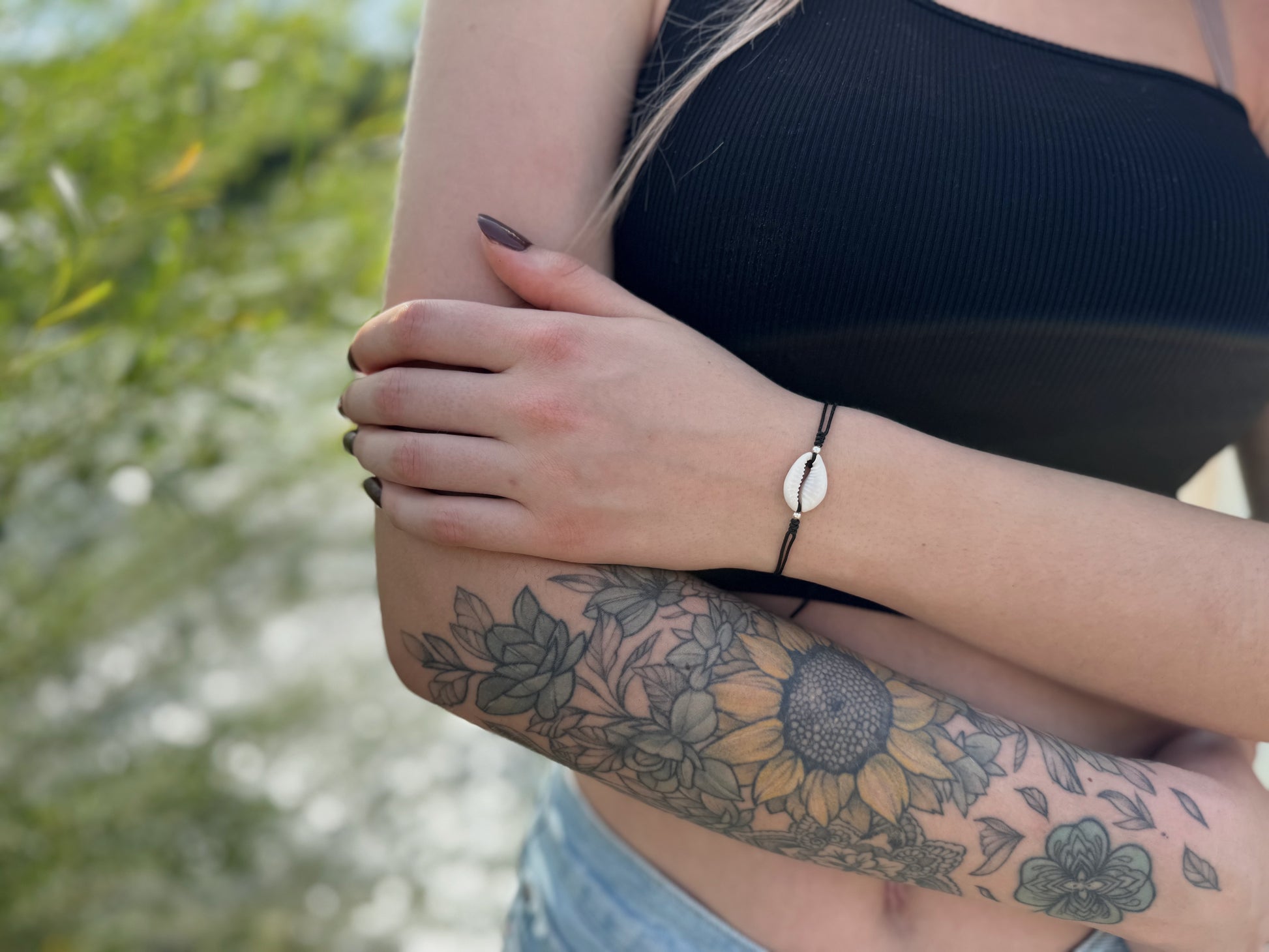 verstellbares, schwarzes Armband mit Kaurimuschel und Silberkügelchen