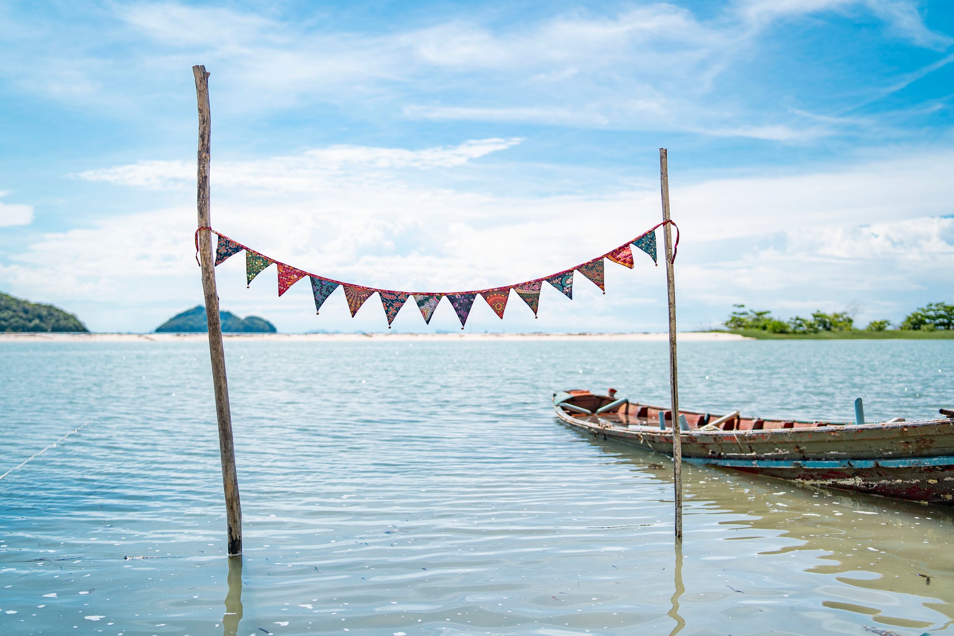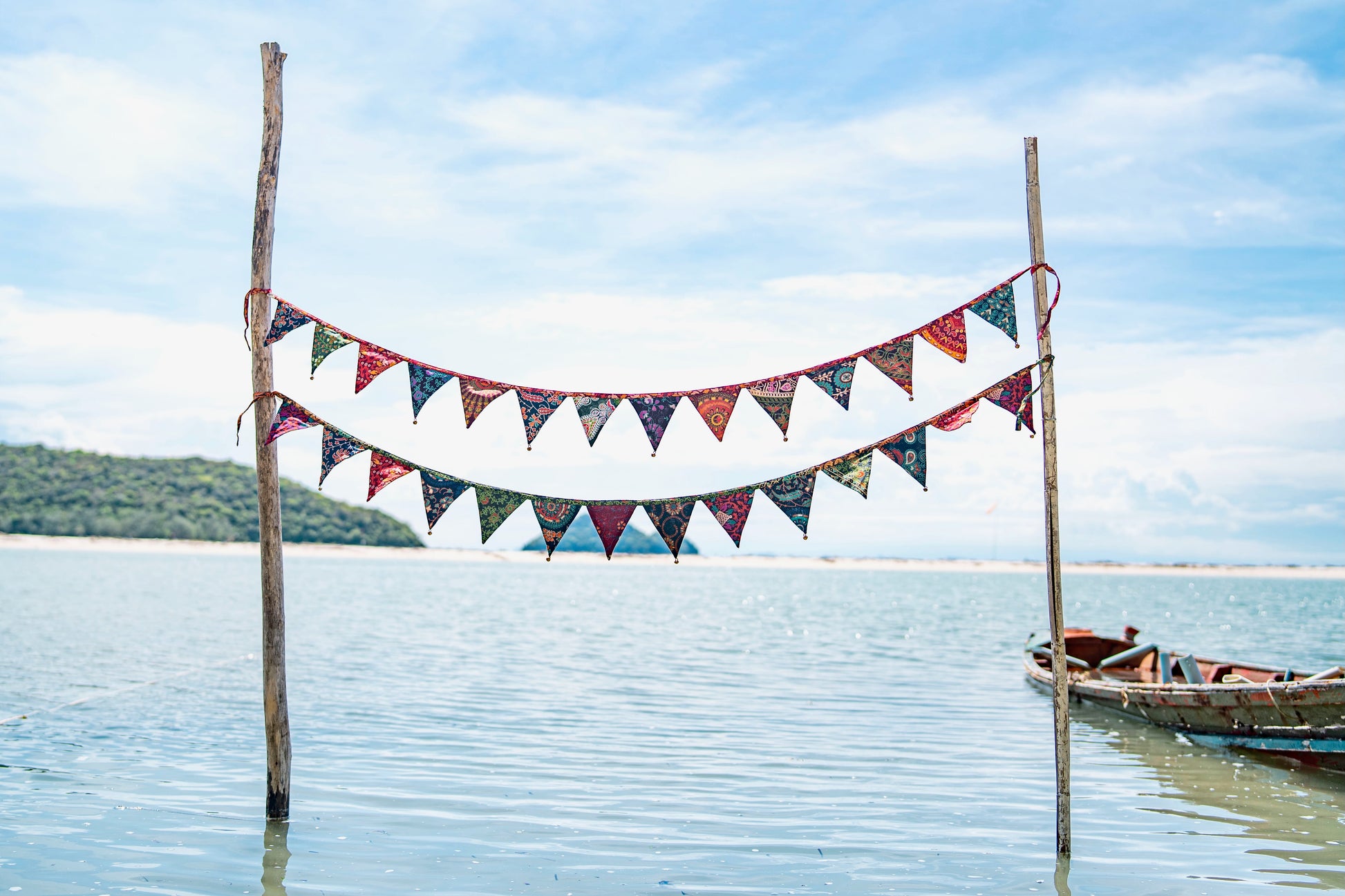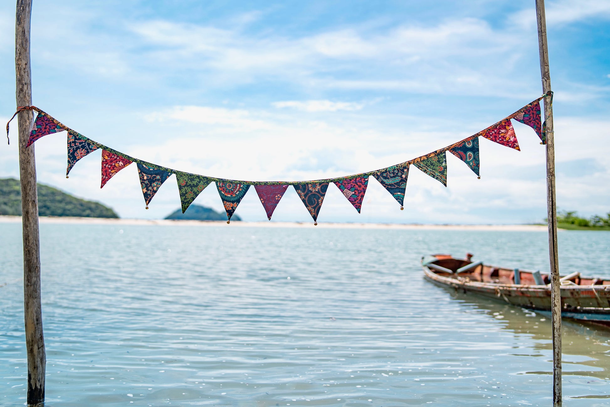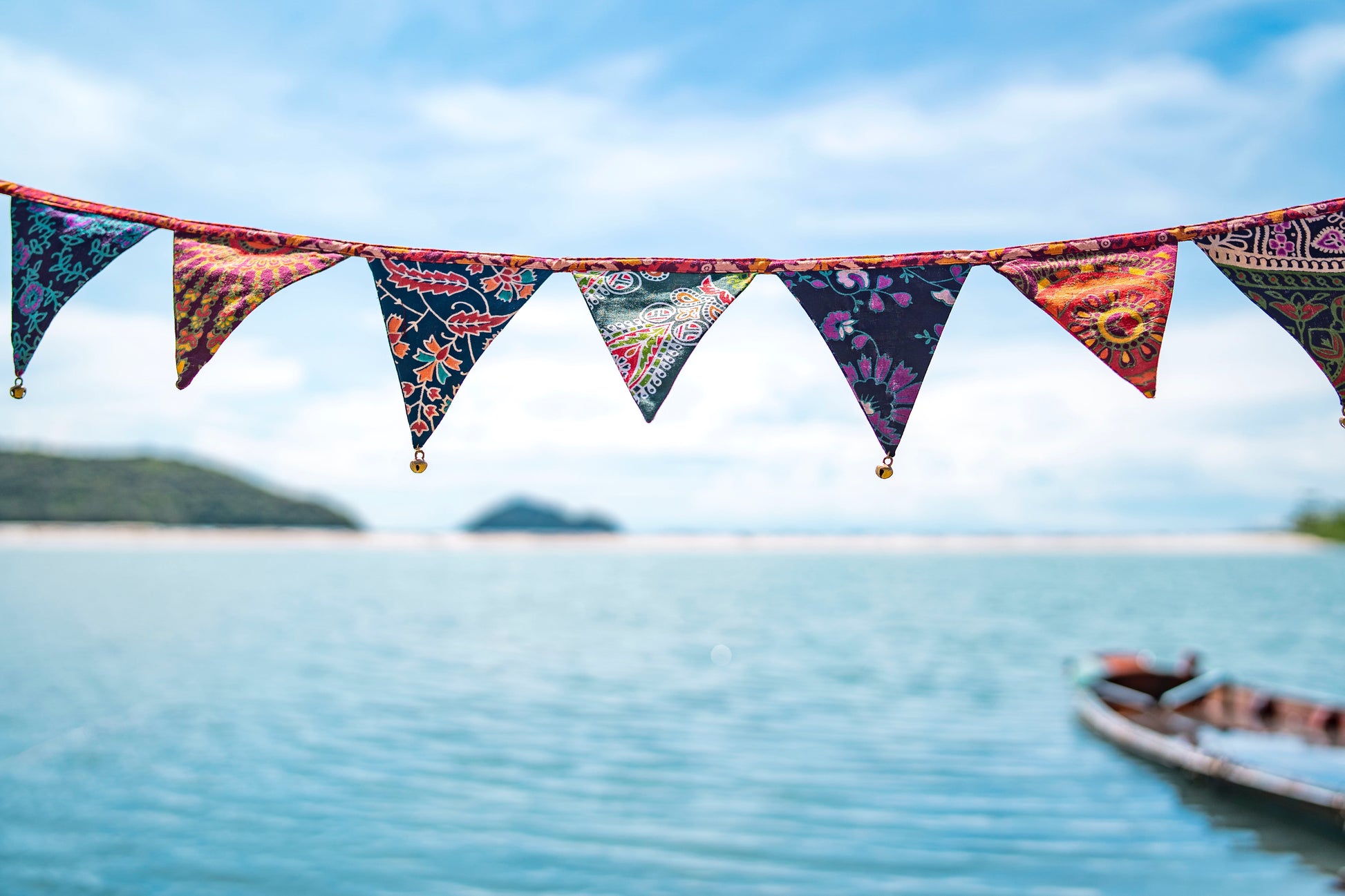 Wimpelkette aus bunten Fahnen mit Glöckchen