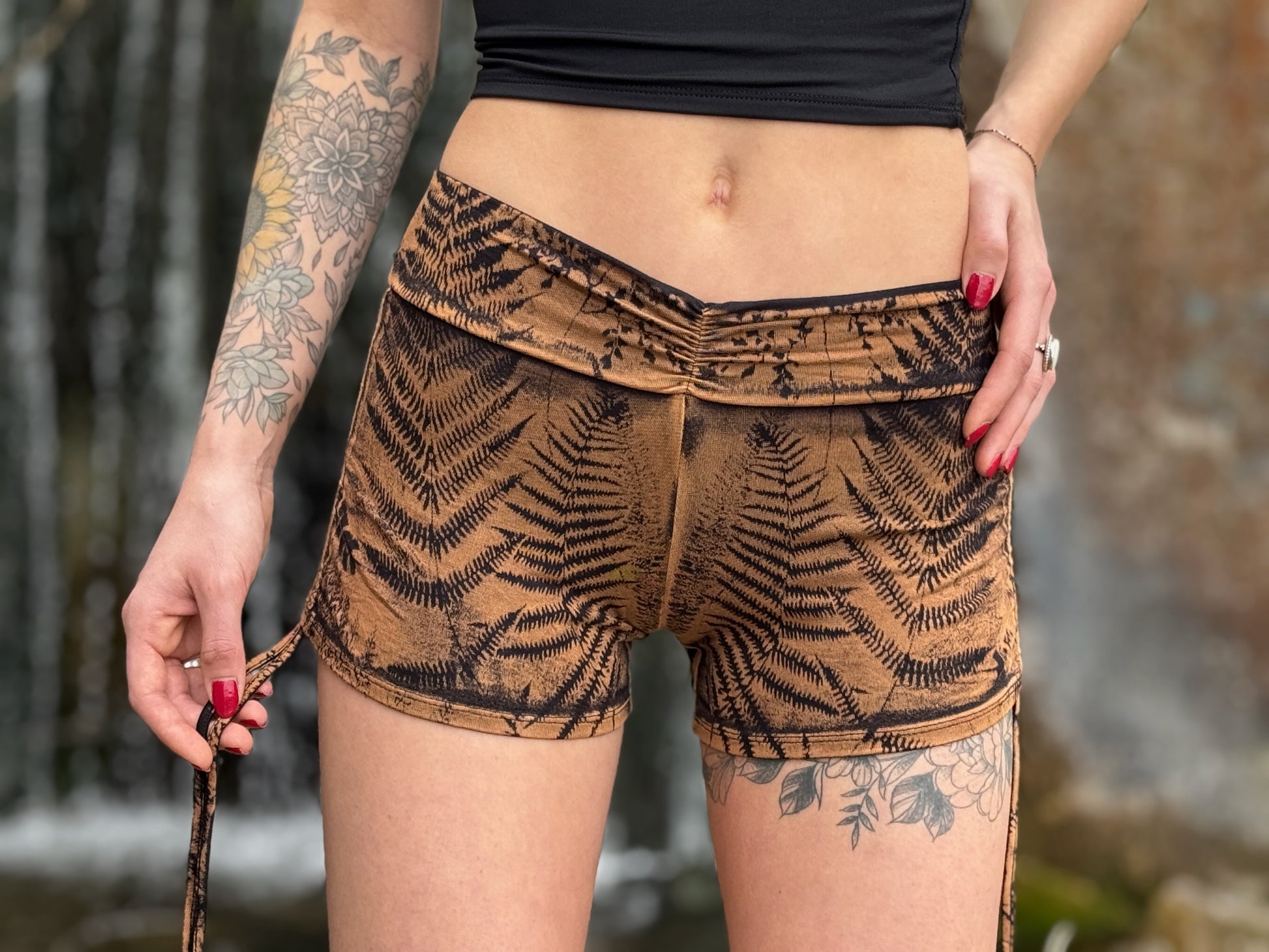 Batik Yoga Shorts mit floralem Print in braun schwarz. Seitlich kann die Shorts gerafft werden um einen anderen Look zu erzeugen.