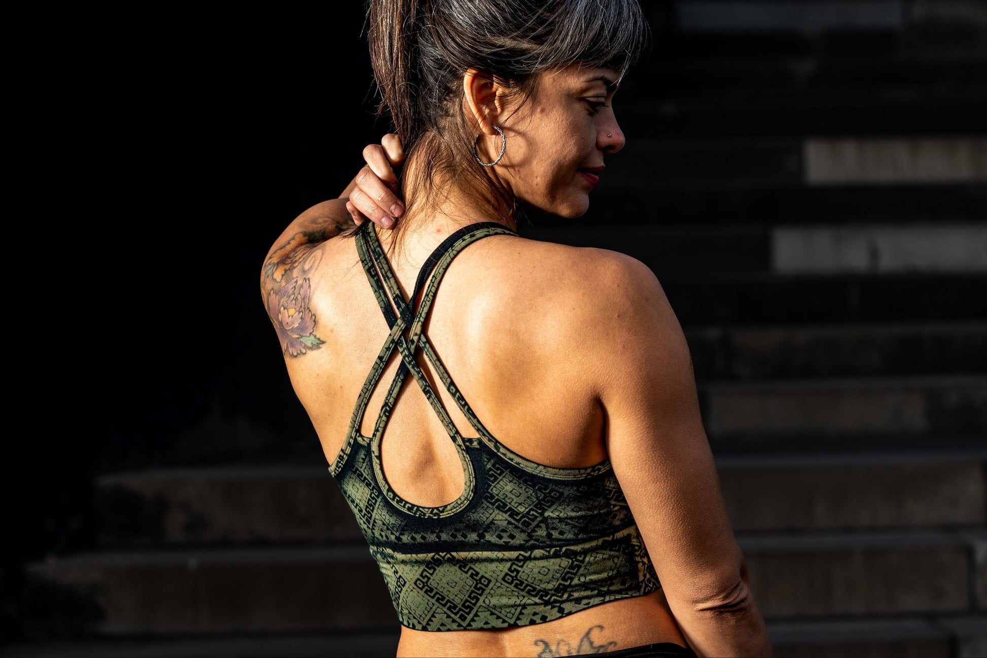 Batik Yoga Top mit geometrischem Muster und detailliertem Rückenmuster in grün beige schwarz