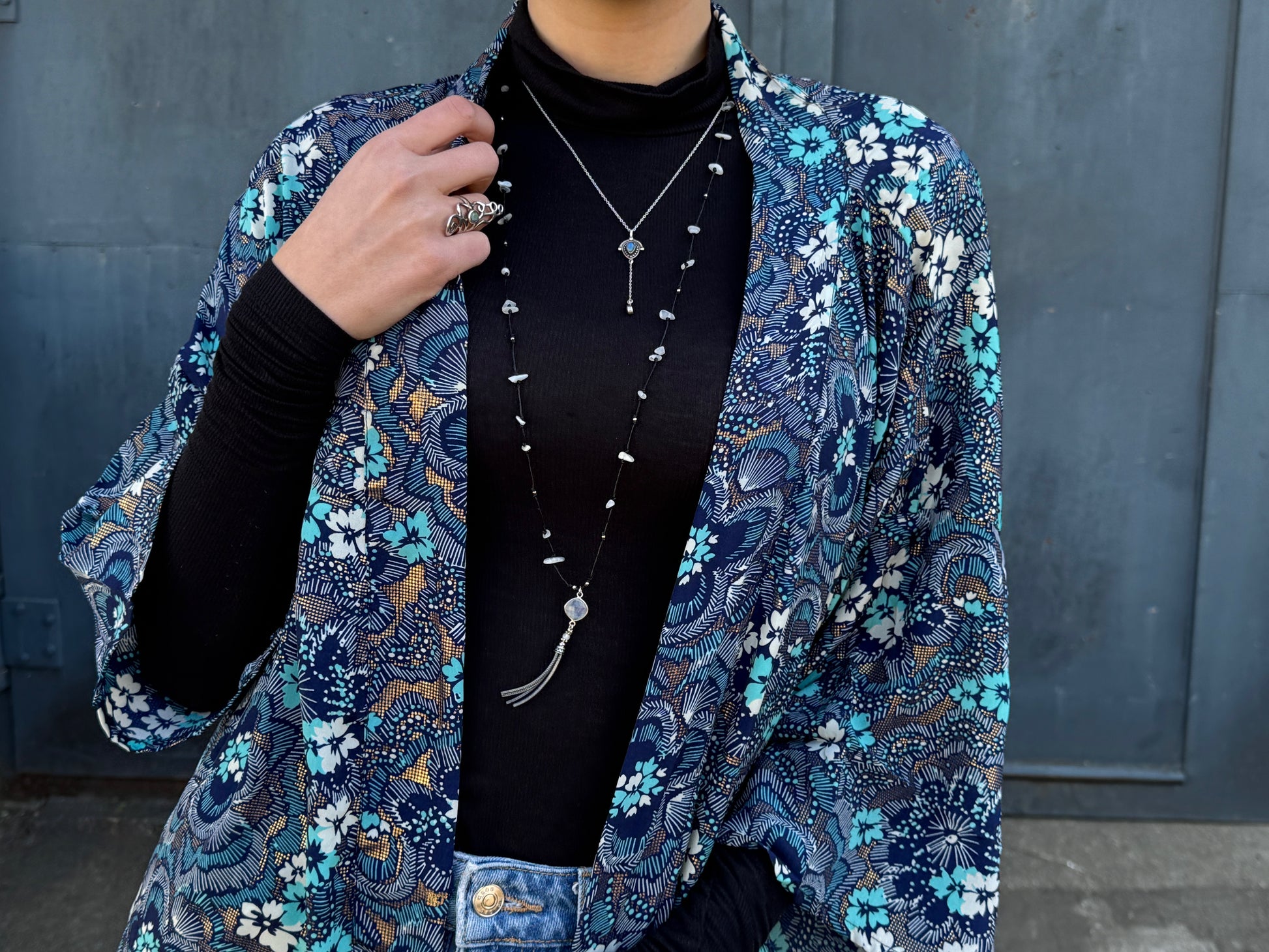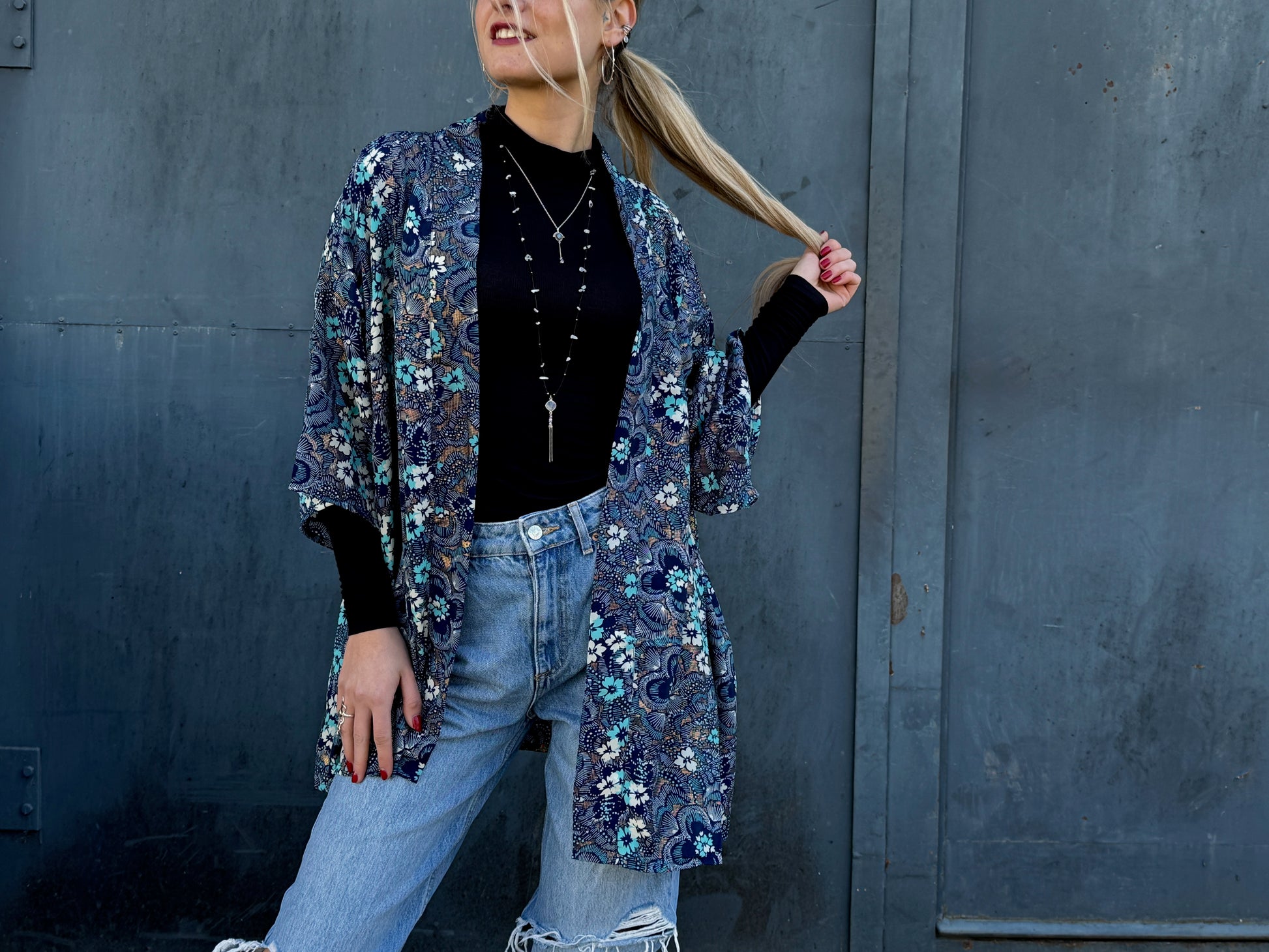 blau floral gemusterter Kimono, Bluse, Überwurf, leichte Jacke
