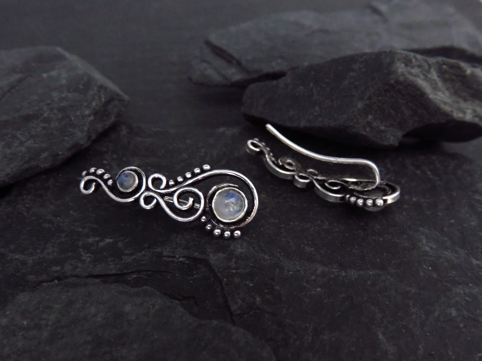 Earclimber Ohrringe mit Regenbogenmondsteinen aus Silber