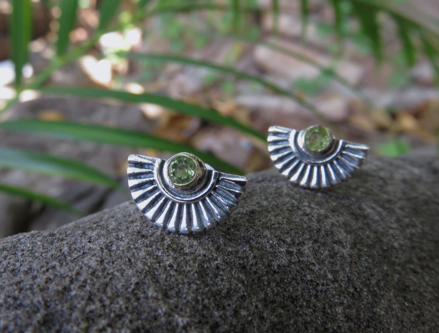 fächerförmige Ohrstecker mit Peridot aus Silber und Messing