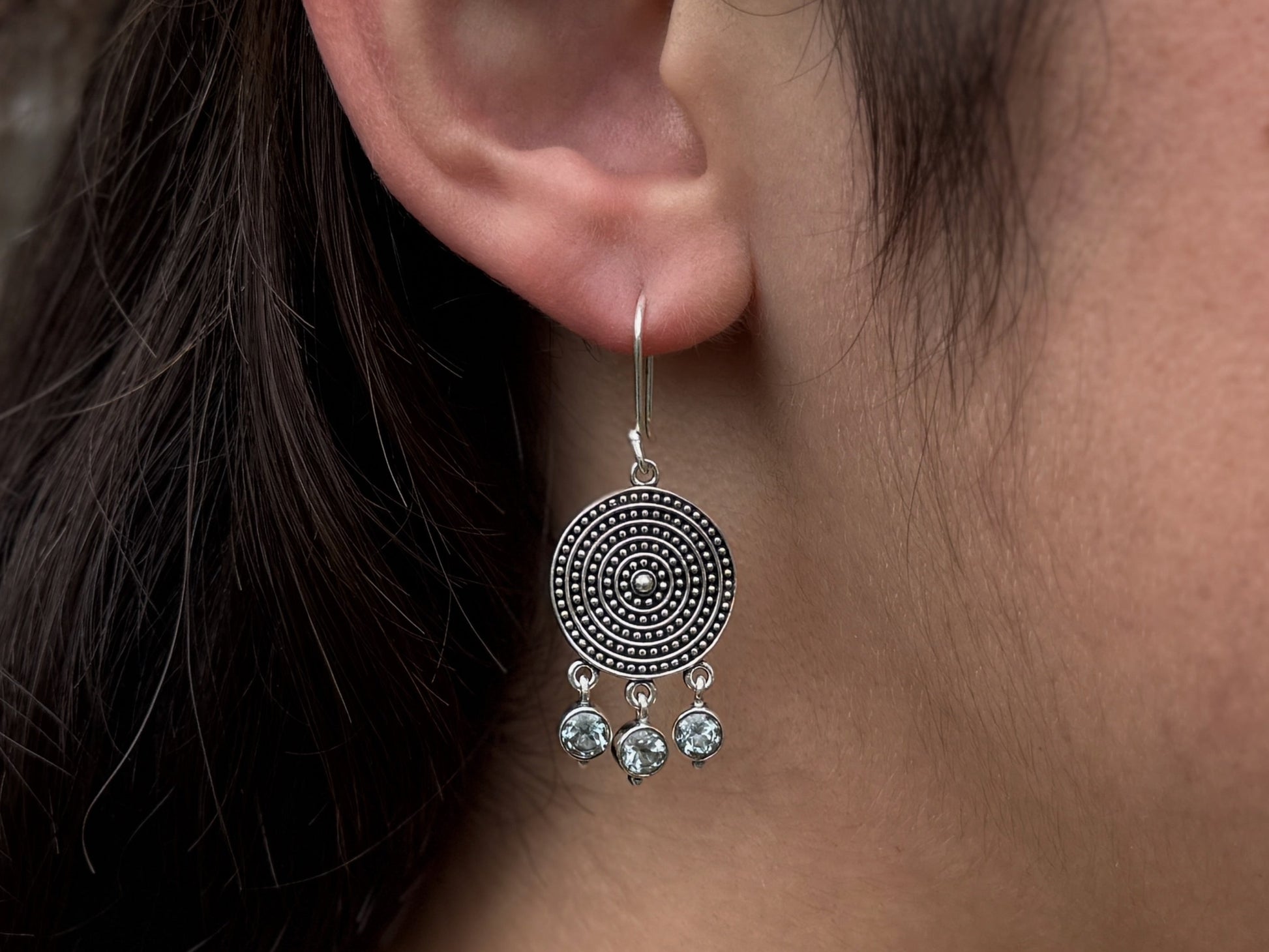filigran verzierte, hängende Ohrringe mit 3 kleinen baumelnden blauen Topas Steinen