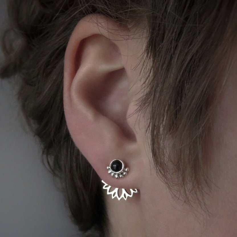 Diese Ohrstecker können variabel getragen werden. Eine Option ist nur den kleinen Stecker ohne Aufsatz zu tragen. Dann gibt es die Möglichkeit den Aufsatz hinter dem Ohr, sowie davor einzusetzen. Der Aufsatz kann auch mit anderen schon vorhandenen Ohrsteckern kombiniert werden.