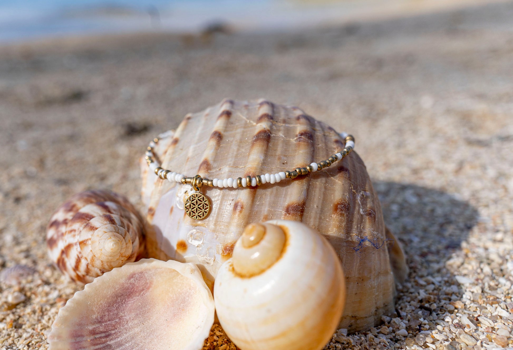 Fusskettchen mit kleinem Anhänger mit dem Motiv der Lebensblume aus Messing
