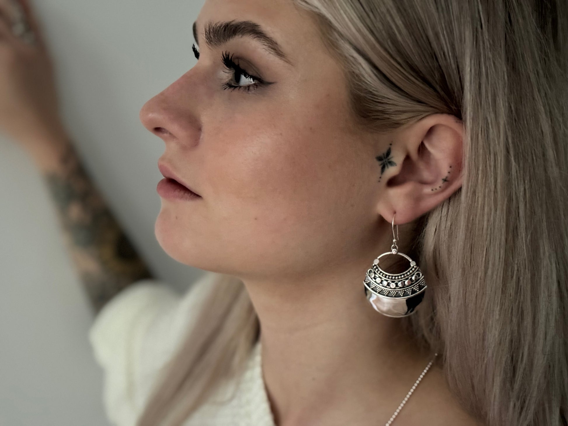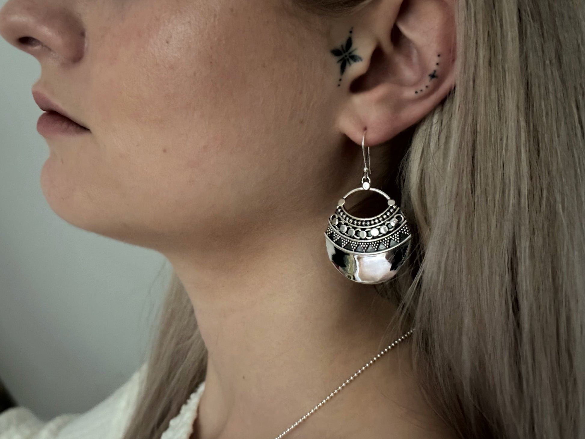 große gewölbte Ohrringe mit detailliertem Muster aus Silber