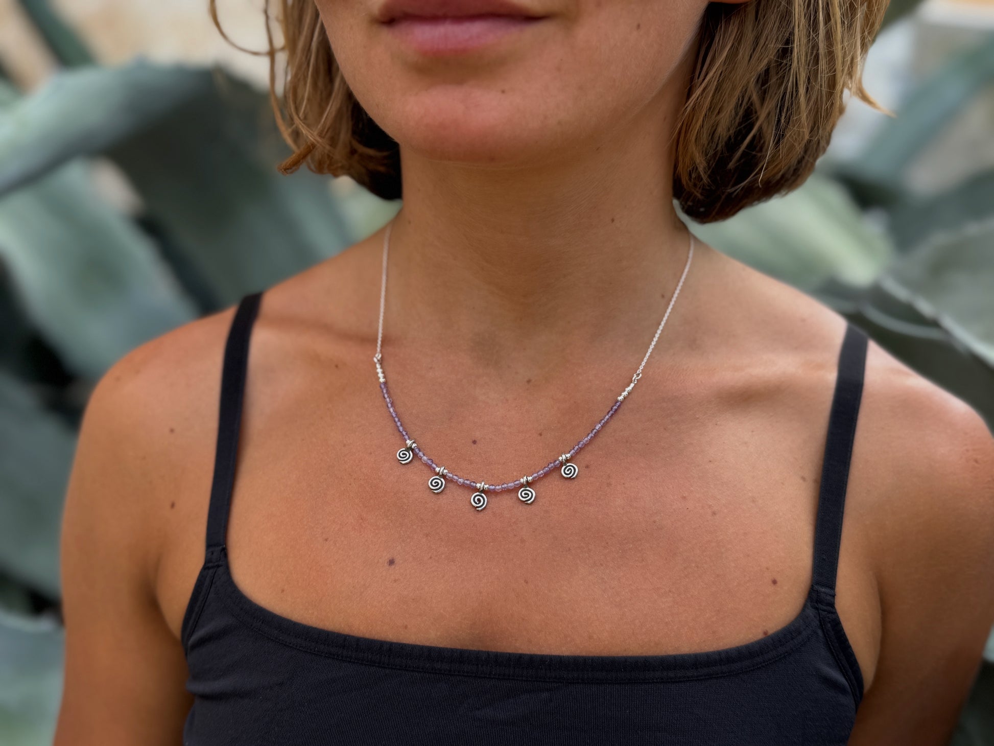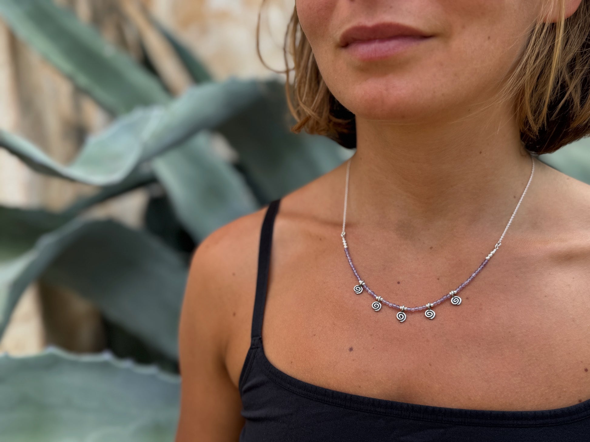 Kette mit 5 kleinen Spiralen und echten Amethyst Steinen, 925er Silber, längenverstellbar