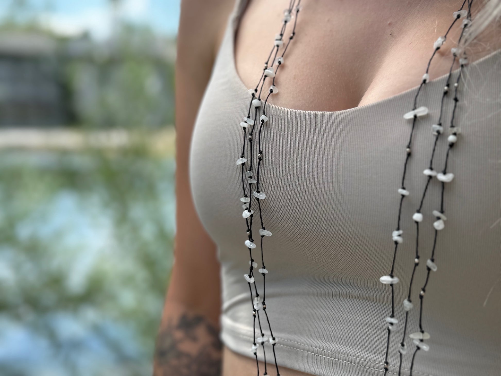 lange geknotete 3 Strang Halskette mit Mondsteinen und kleinen Silberperlen.